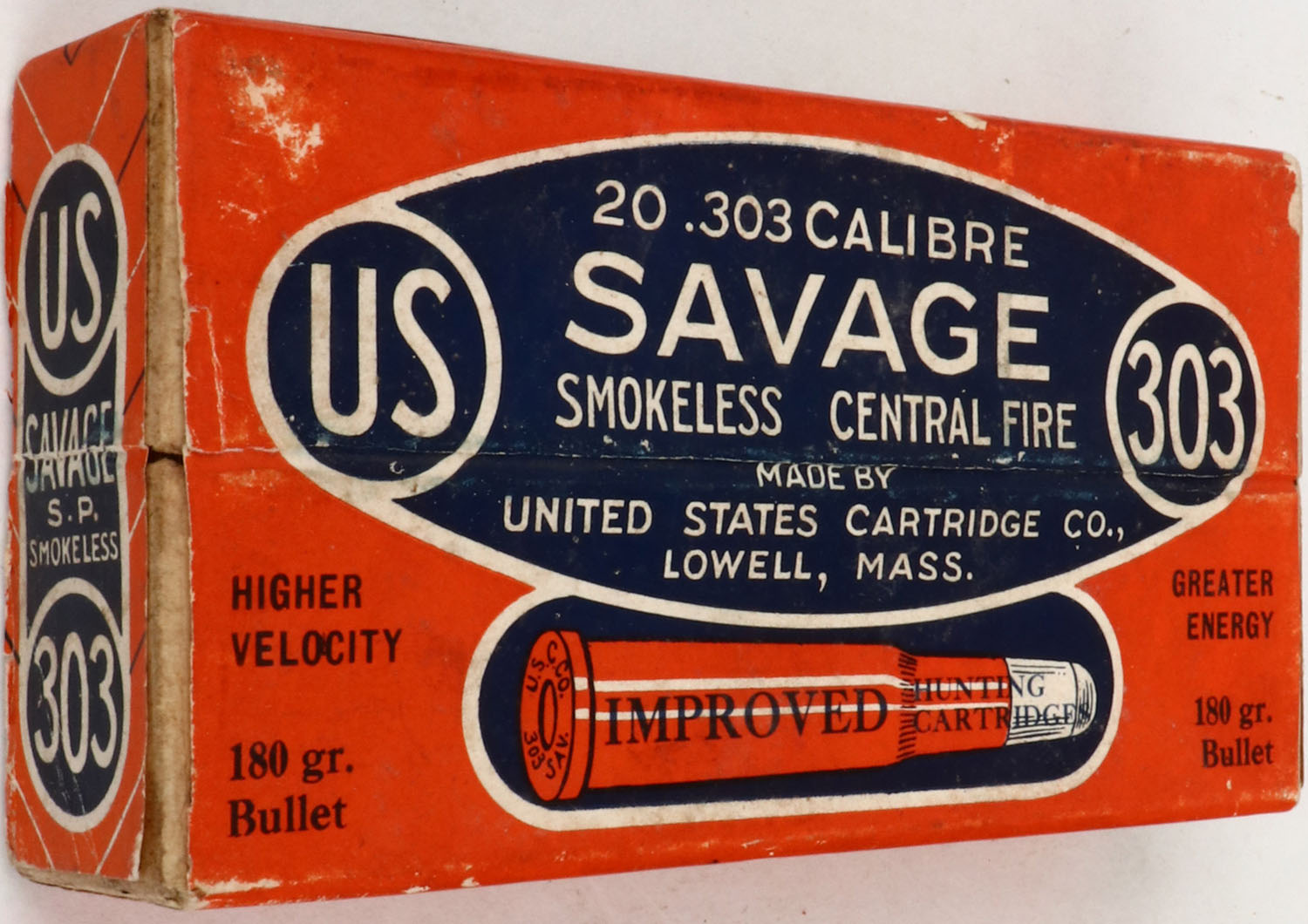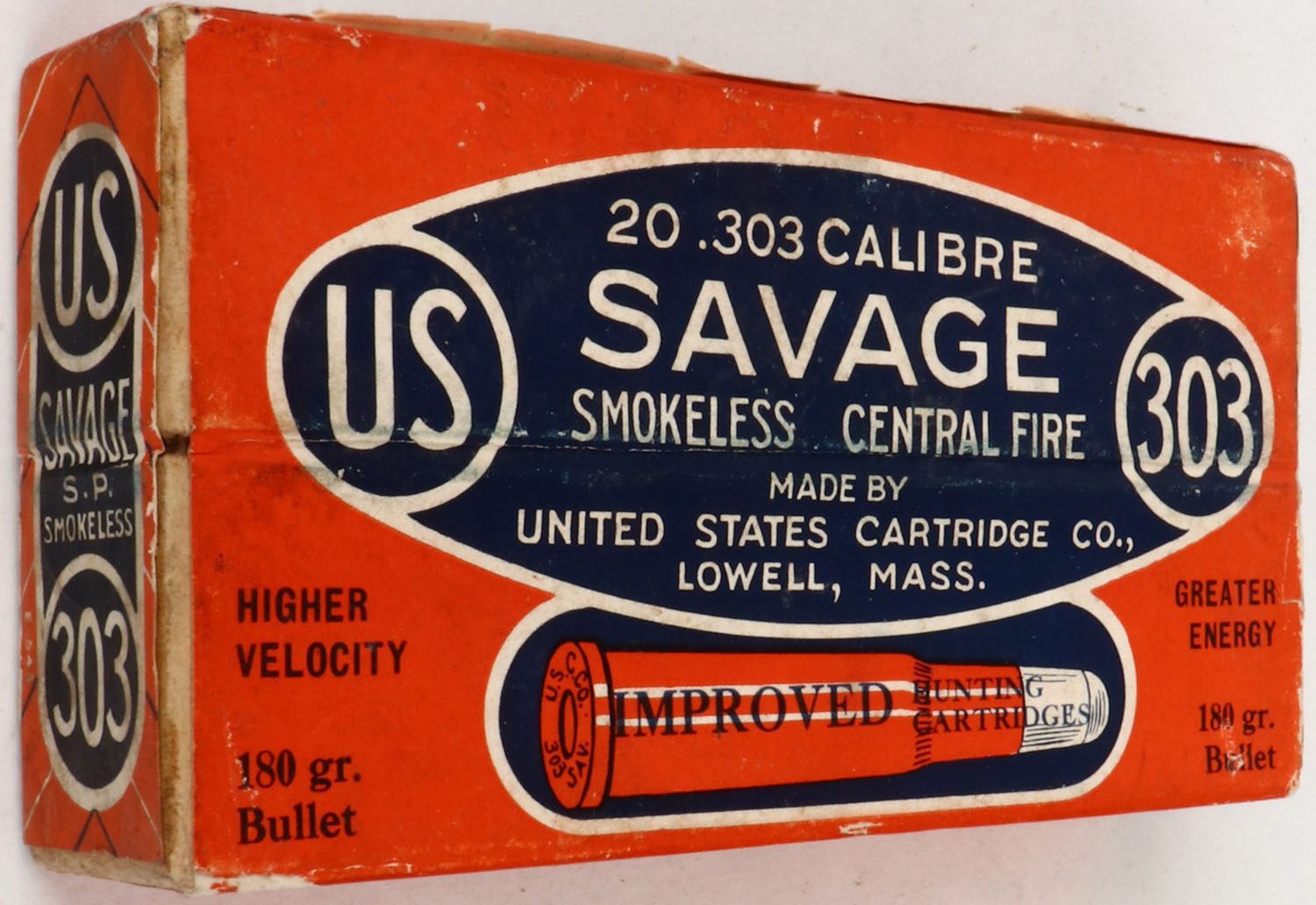 U.S. Cart. Co., Improved Hunting Cartridges, .303 Savage, 180 Gr. Soft-Point Bullet, Smokeless, FULL & SEALED, 2pc. Orange blue & white box, box is solid with excellent color, scuffing to top, very minor edge & corner wear, labels are intact. Grade: Very Good ++ - Value: 40 to 120