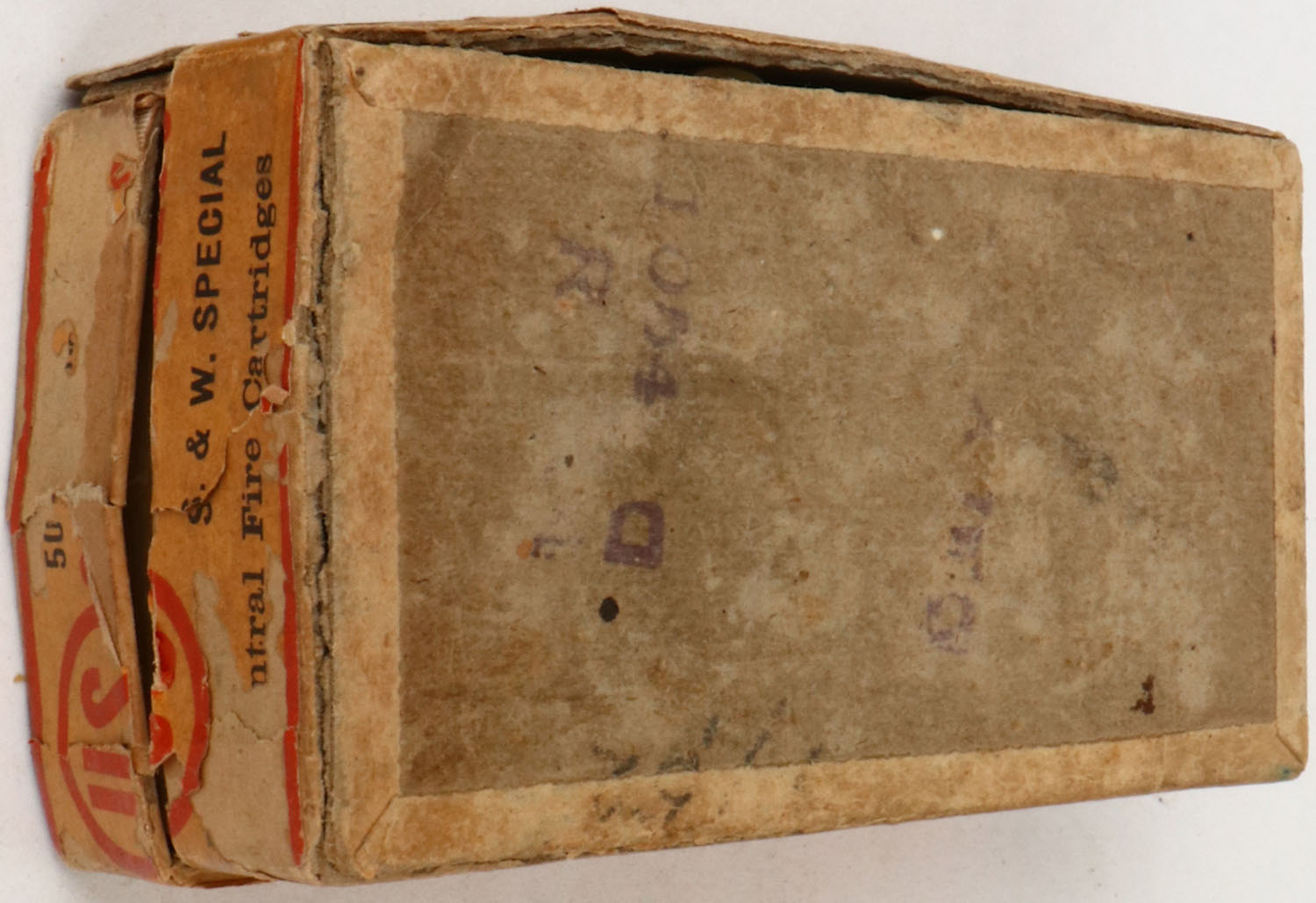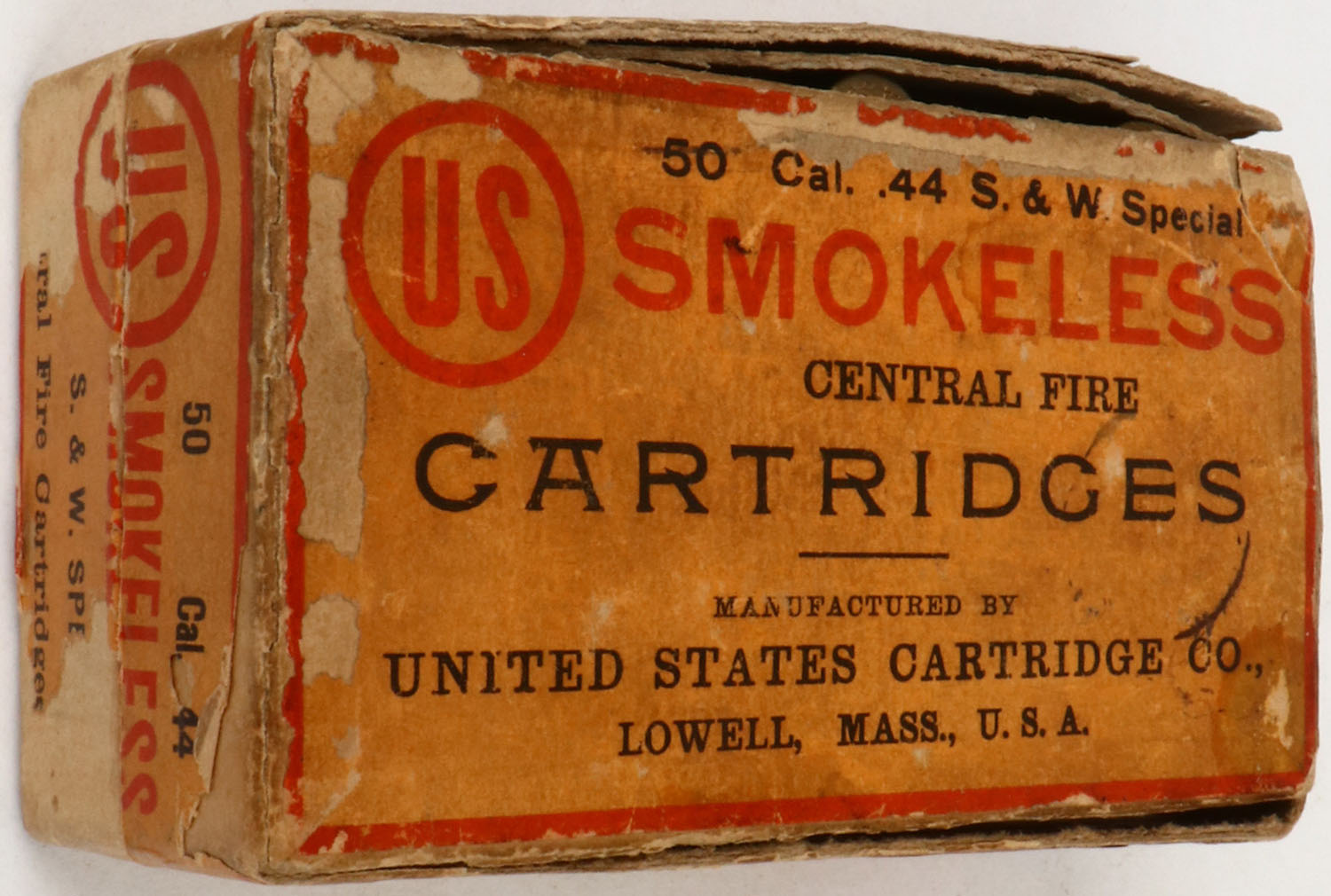 U.S. Cart. Co., .44 S&W Special, Smokeless, Full of mixed primers, 2pc. Buff box with orange & red labels, box has several seam splits to top & bottom, age soiling, edge & corner wear, shelf wear, ammo is very good to excellent. Grade: Fair ++ - Value: 10 to 60