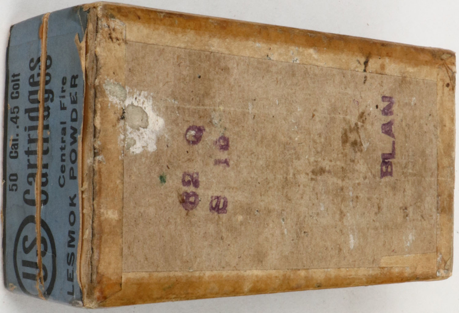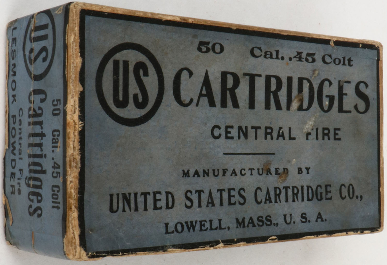 U.S. Cart. Co., .45 Colt, Black Powder, Full of mixed primers, 2pc. Buff box with blue & black top & side sealing labels, box is solid with excellent color, age soiling, some edge & corner wear, tape to bottom front edge, labels are intact, ammo is very good to excellent. Grade: Very Good ++ - Value: 30 to 90
