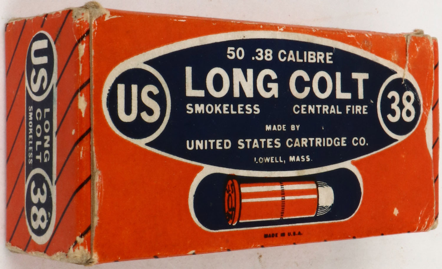 U.S. Cart. Co., .38 Long Colt, Smokeless, Full, 1pc. Orange blue & white box, box is solid with excellent to minty color, corner wear, small tear to top, very minor scuffing on bottom, edges are mostly crisp, end flaps are solid, ammo is excellent. Grade: Very Good ++ - Value: 30 to 90