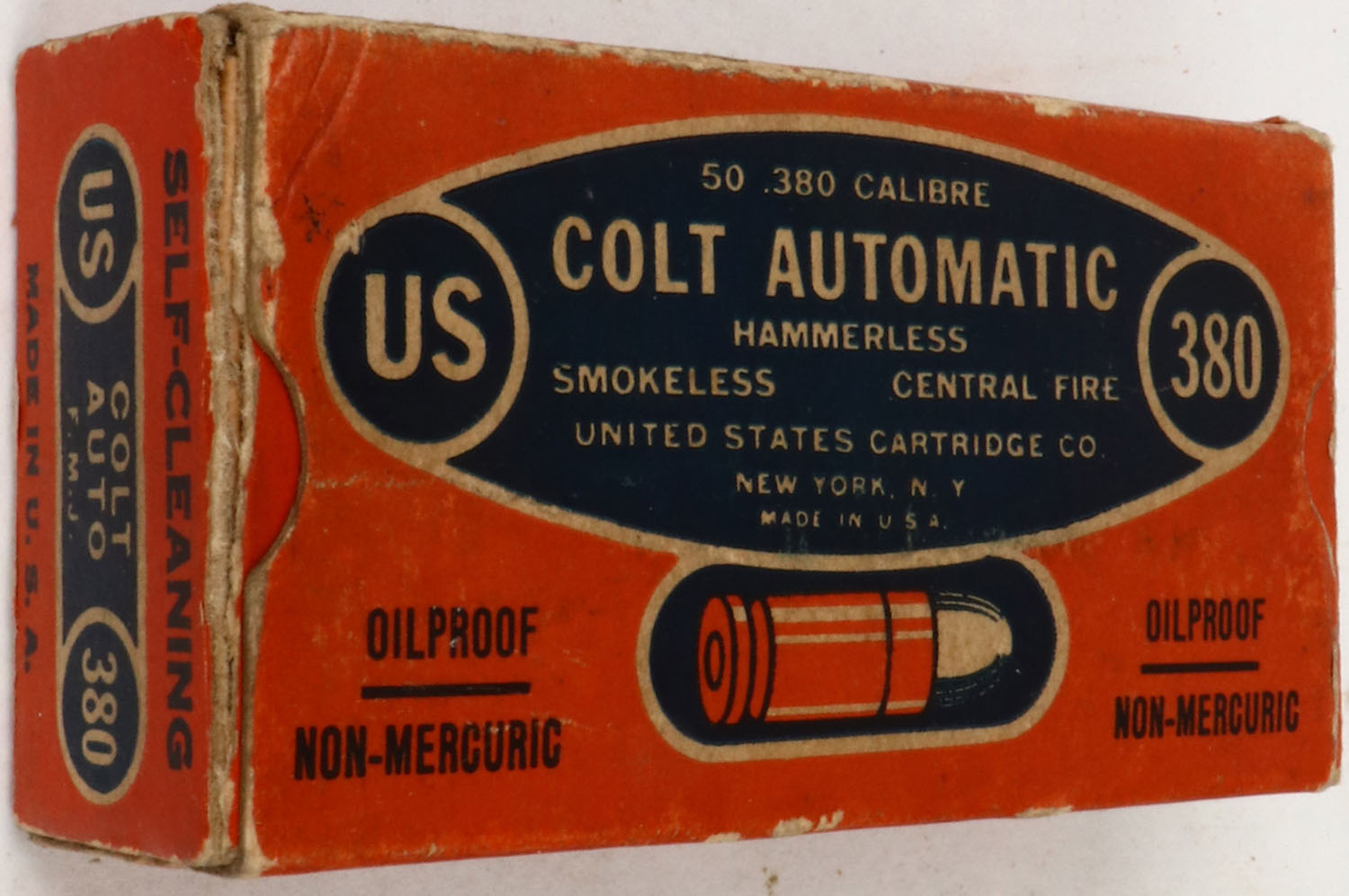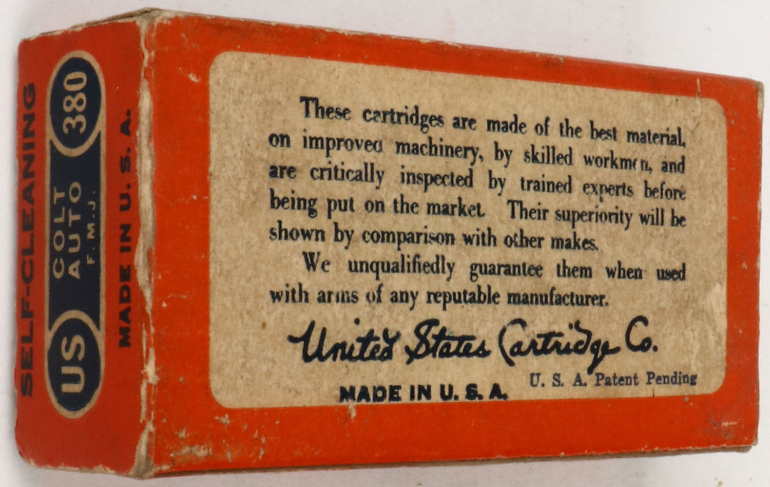 U.S. Cart. Co., .380 Colt Automatic, Smokeless, Full Metal Jacket, Full, 1pc. Orange blue & white box, box is solid with excellent color, some age soiling, partial seam split to left end flap, minor edge & corner wear, ammo is excellent. Grade: Very Good ++ - Value: 20 to 60