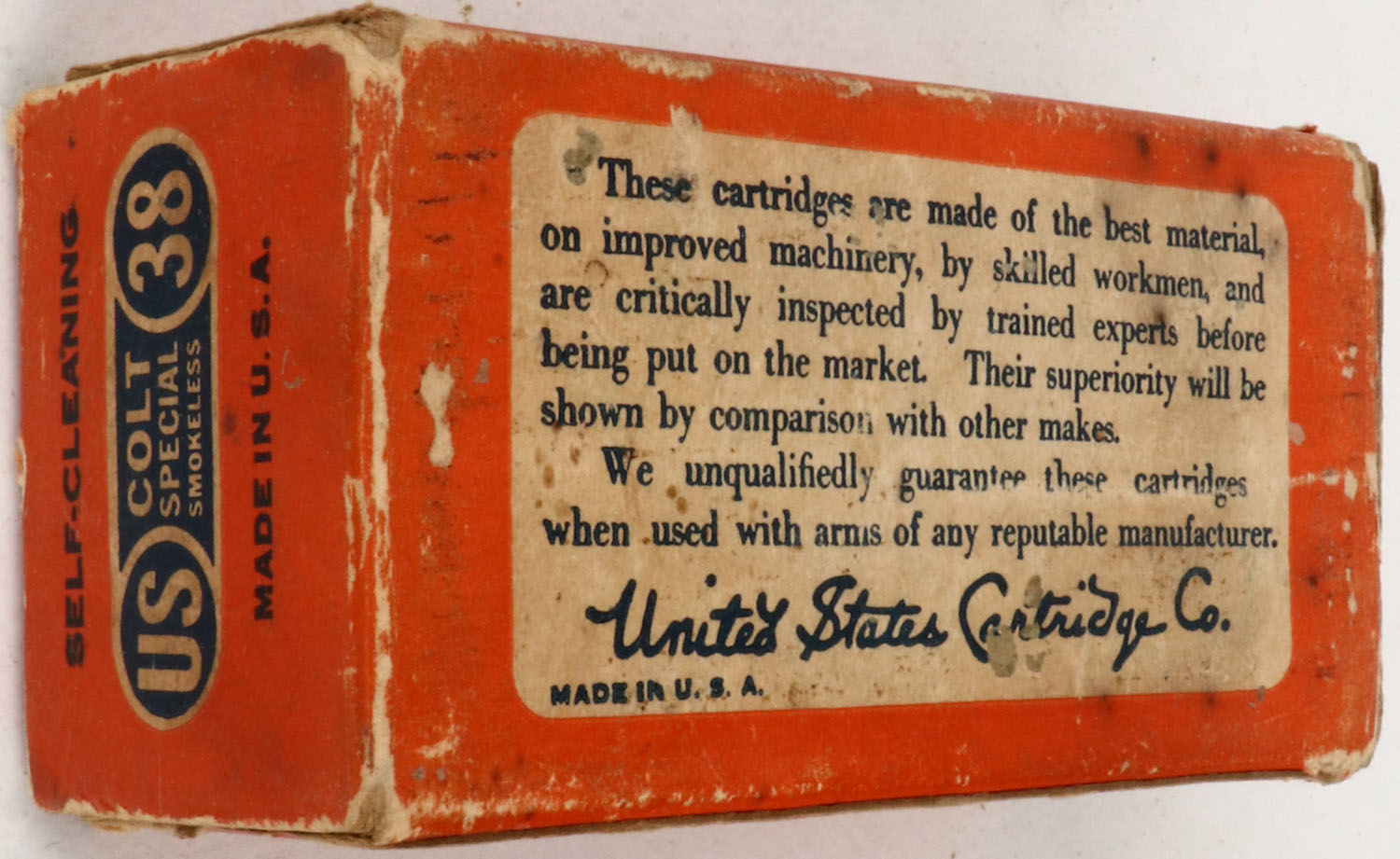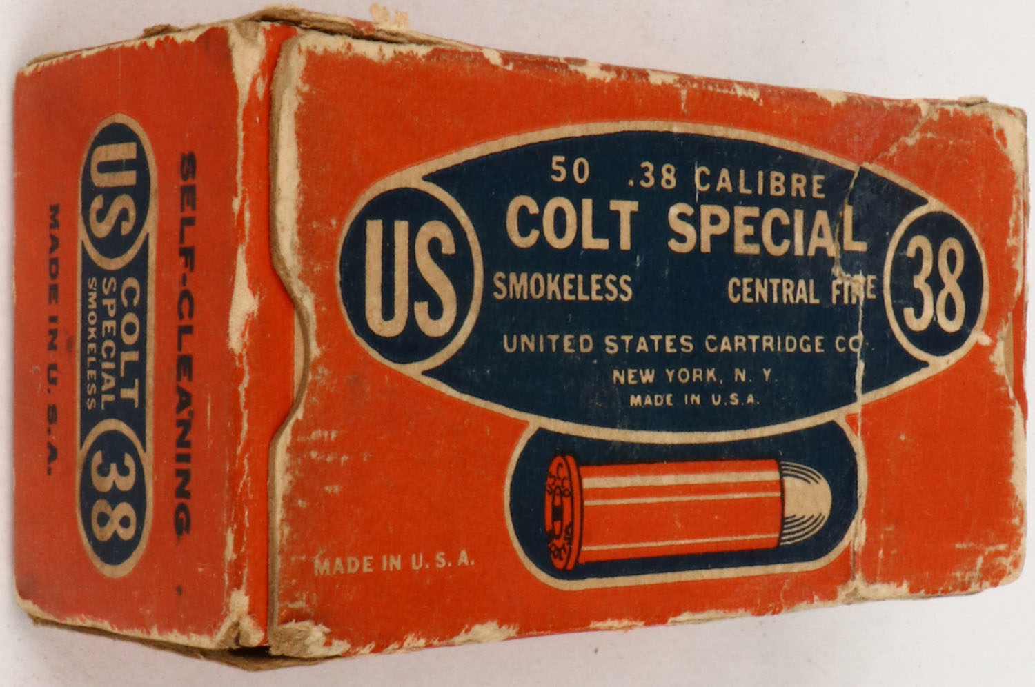 U.S. Cart. Co., .38 Colt Special, Smokeless, Full, 1pc. Orange blue & white box, box is solid with very good to excellent color, 2 partial seam splits to top edges, edge & corner wear, end flaps are mostly solid, ammo is very good. Grade: Very Good - Value: 20 to 60