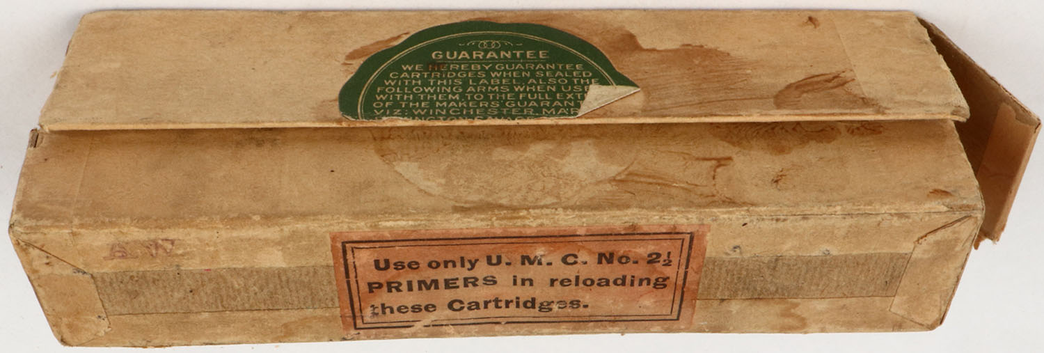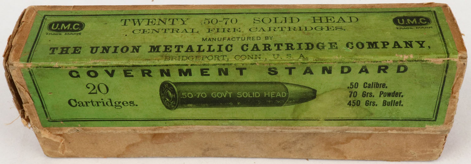 UMC, Government Standard, .50-70 Gov't Solid Head, 70 Grs. Powder, 450 Grs. Bullet, Partial 18rds. 2pc buff box with green & black label, box has excellent color, very minor age soiling, right end of lid is missing, vertical seam splits to both sides of left end of lid, some staining, ammo is excellent. Grade: Good ++ - Value: 50 to 150