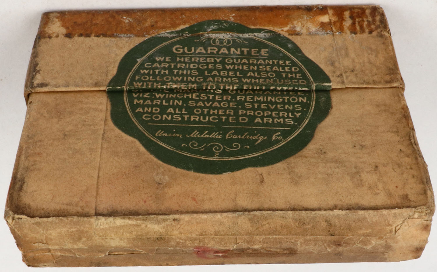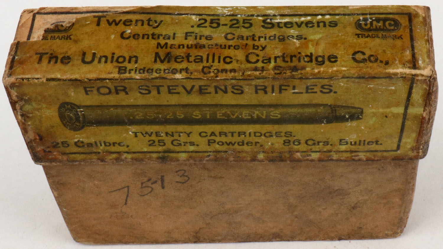 UMC, .25-25 Stevens, 25Grs. Powder, 86 Grs. Bullet, FULL & SEALED, 2pc. Buff box with yellow label, box is solid with very good color, age soiling front has been written on, tape on lid, minor edge & corner wear, labels are intact. Grade: Very Good - Value: 80 to 250