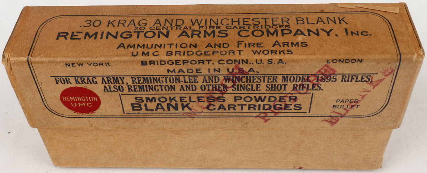 REM-UMC, .30 Krag And Winchester Blank, Smokeless Powder, Full, 2pc. Buff box with buff label, box is solid with minty color, very minor corner wear, edges are mostly crisp, label is intact, ammo is excellent. (1085) Grade: Excellent - Value: 20 to 60