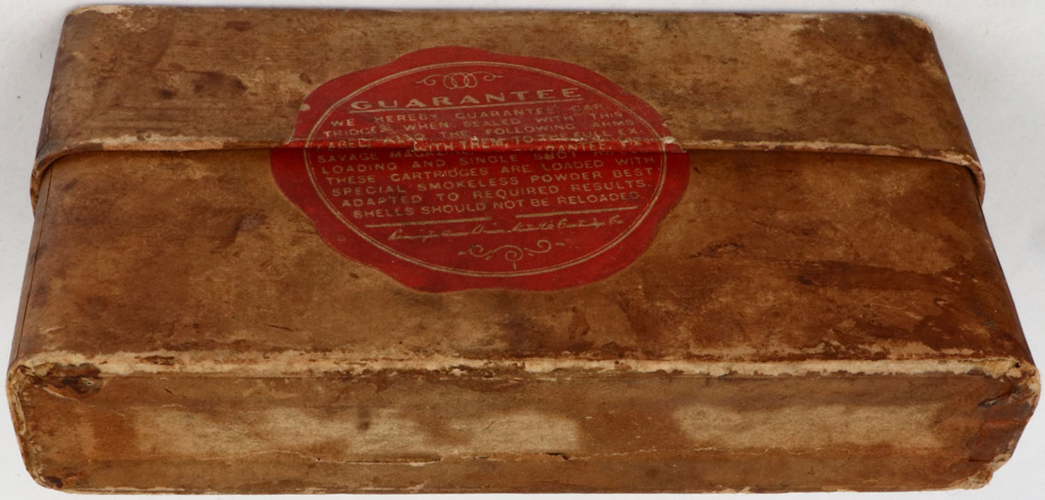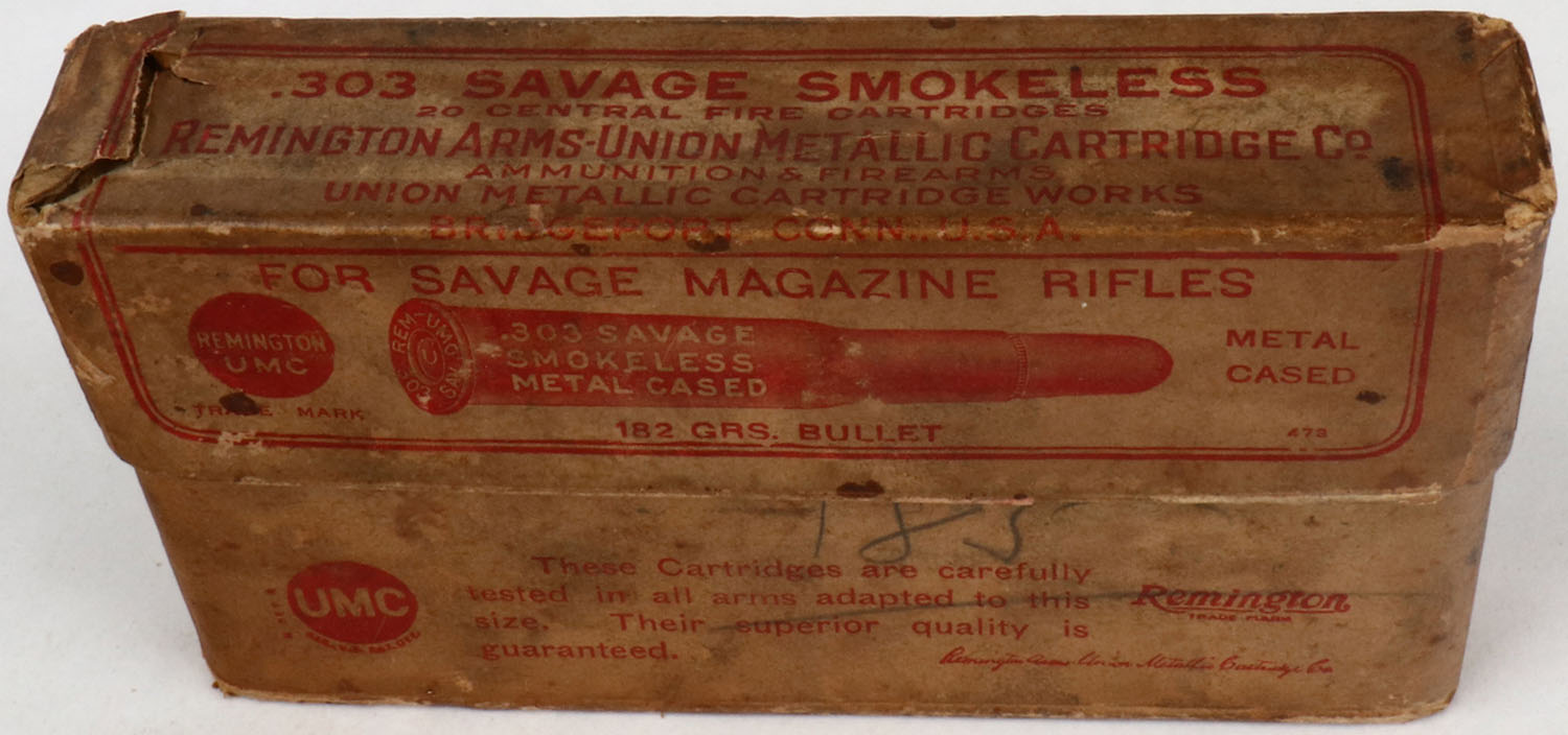 REM-UMC, .303 Savage, 182 Grs. Metal Cased Bullet, Partial 18rds. 2pc. Buff box with buff & red labels, box is solid with very good to excellent color, age soiling, some edge & corner wear, front has been written on, labels are intact, ammo is good to very good. (1288) Grade: Excellent - Value: 10 to 50