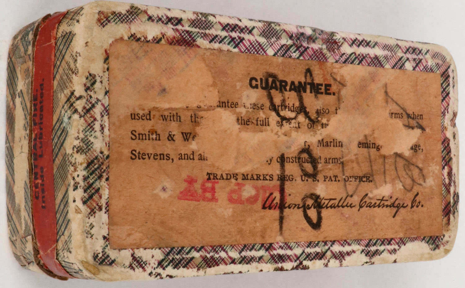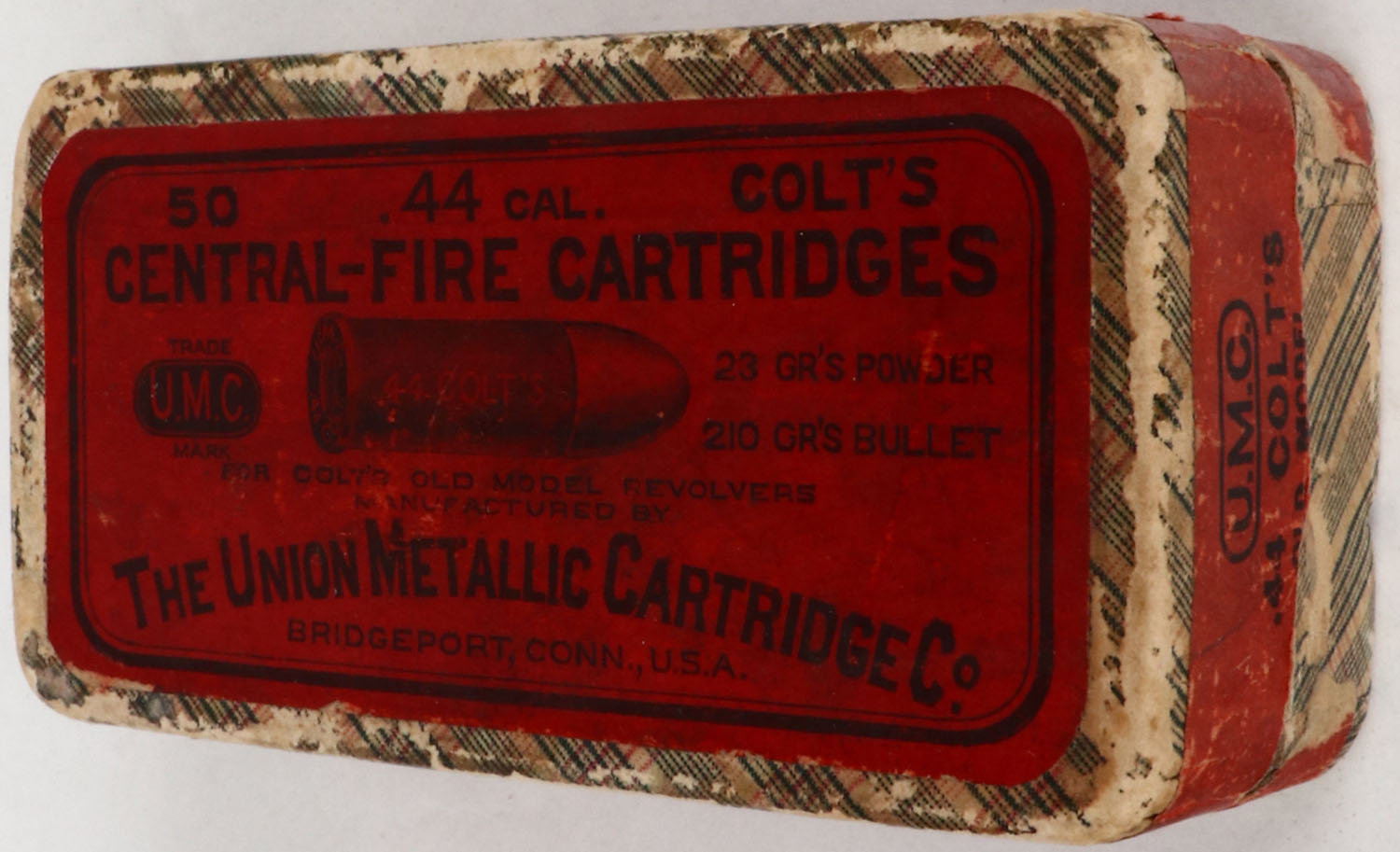 UMC, .44 Colt's, 23 Gr's Powder, 210 Gr's Bullet, Full, 2pc. Fabric box with red top & side sealing labels, box is solid with excellent color, very minor age soiling, edge & corner wear, side sealing label is 75% intact. Grade: Very Good - Value: 100 to 300