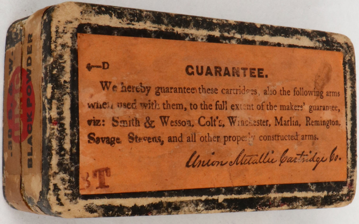 UMC, .38 S&W, 15 Gr. Powder, 146 Gr, Bullet, Partial 42rds., 2pc. Black mottled box with gray top & buff side sealing labels, box is solid with excellent color, very minor age soiling, edge & corner wear, side sealing label is 60% intact, ammo is excellent. (608) Grade: Very Good ++ - Value: 10 to 50