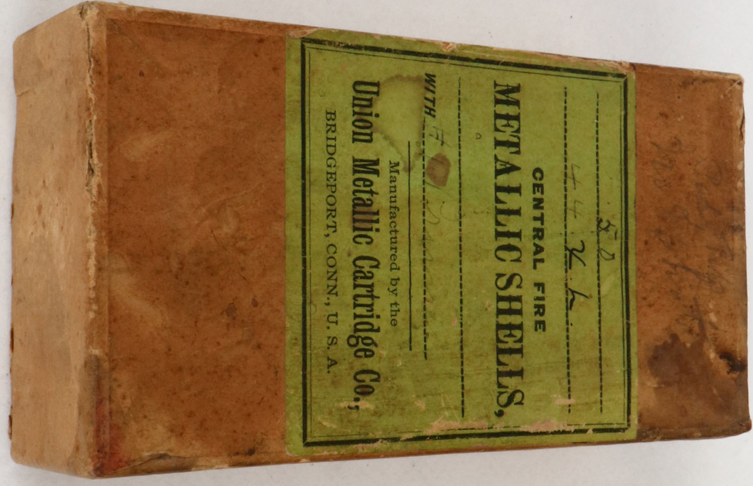 UMC, .44 XL Empty Primed Shells, Full, 2pc. Buff box with green label, 2 vertical seam splits to bottom of box, box has excellent color, some age soiling & staining, top has been written on, very minor edge & corner wear, ammo is excellent. (911) Grade: Very Good - Value: 8 to 40