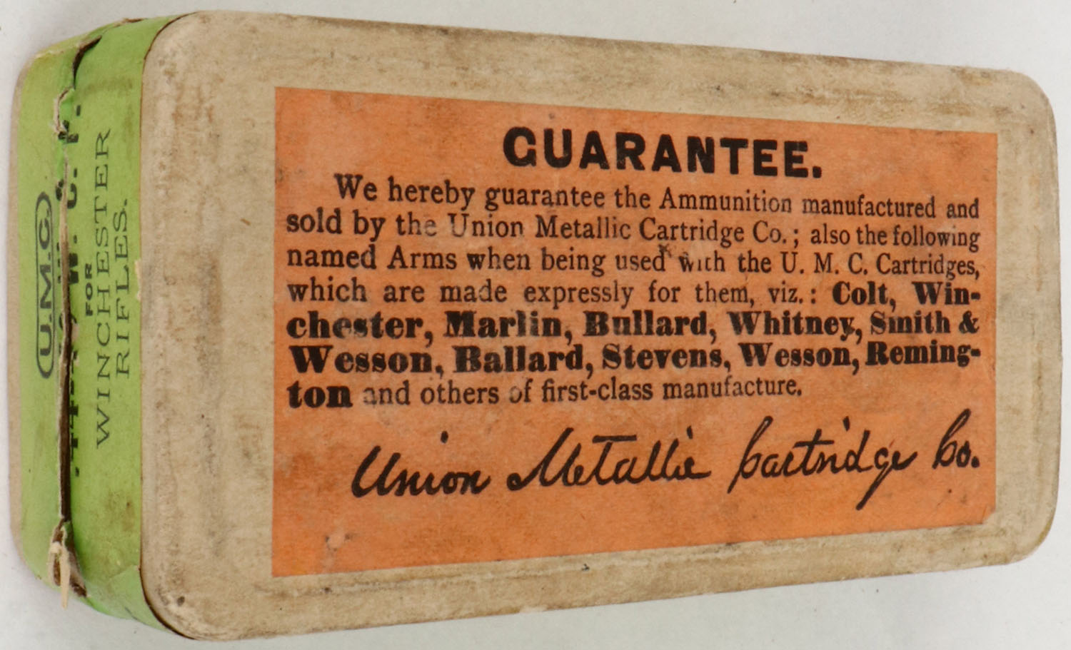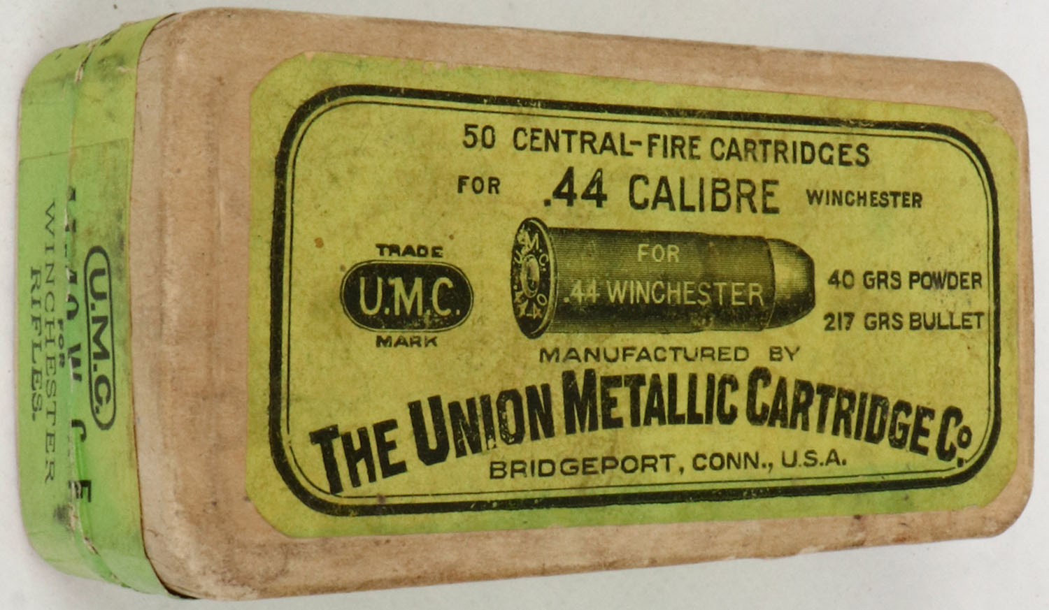 UMC, .44 Winchester, 40 Grs Powder, 217 Grs Bullet, Full, 2pc. Buff box with green top & side sealing labels, box is solid with excellent color, minor age soiling, very minor edge & corner wear, labels are intact, ammo is good to very good. Grade: Excellent - Value: 60 to 180