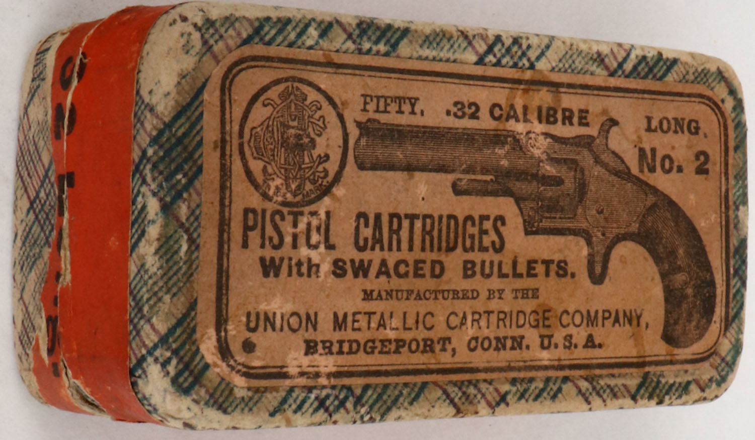 UMC, .32 Long, No.2, Full, 2pc. Fabric box with salmon top & orange side sealing labels, box is solid with very good to excellent color, minor age soiling, some edge & corner wear, minor shelf wear, side sealing label is 95% intact, ammo is very good. Grade: Very Good ++ - Value: 20 to 100
