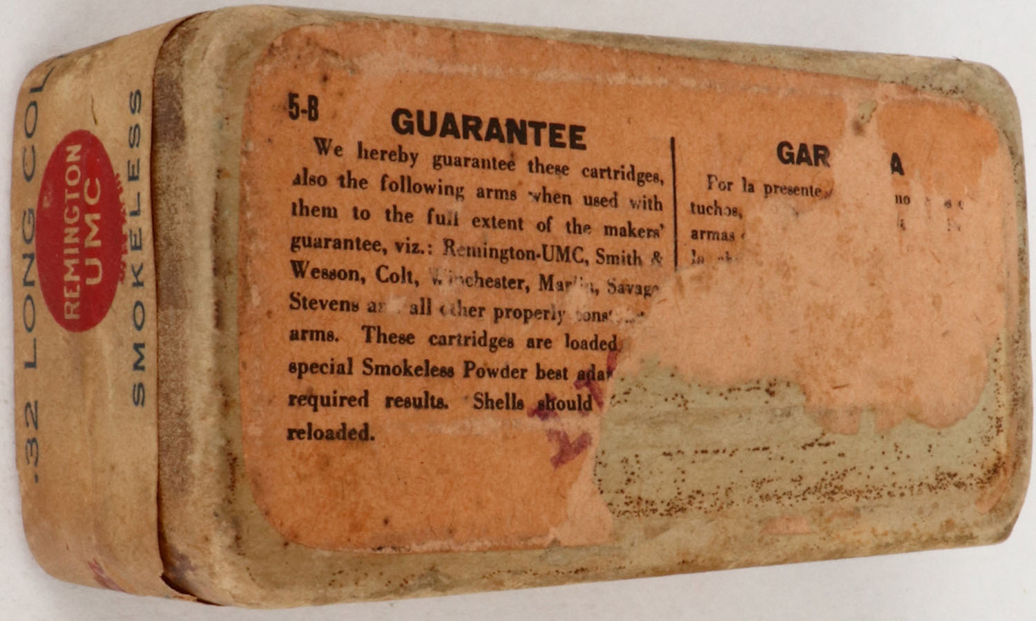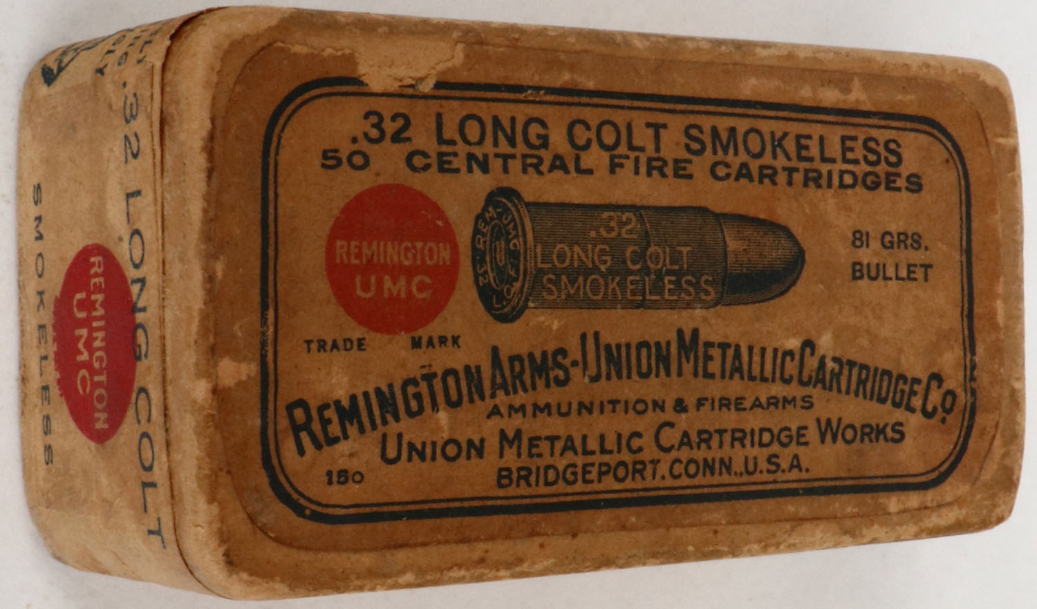 REM-UMC, .32 Long Colt, Smokeless, 81 Grs. Bullet, Specially Adapted for .32 Colt Double Action and Other Arms, FULL & SEALED, 2pc. Buff box with buff top & side sealing labels, box is solid with excellent color, very minor age soiling, minor shelf wear, half of bottom label is scuffed off, very minor edge & corner wear, labels are intact. (625) Grade: Very Good ++ - Value: 40 to 200