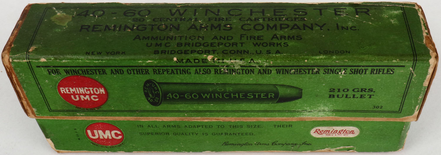 REM-UMC, .40-60 Winchester, 210 Grs. Bullet, Black Powder, Full of incorrect (W.R.A. H/S) ammo, 2pc. Buff box with green labels, box is solid with excellent color, very minor age soiling, some shelf & edge wear, minor corner wear, labels are intact, ammo is excellent. Grade: Excellent - Value: 10 to 100