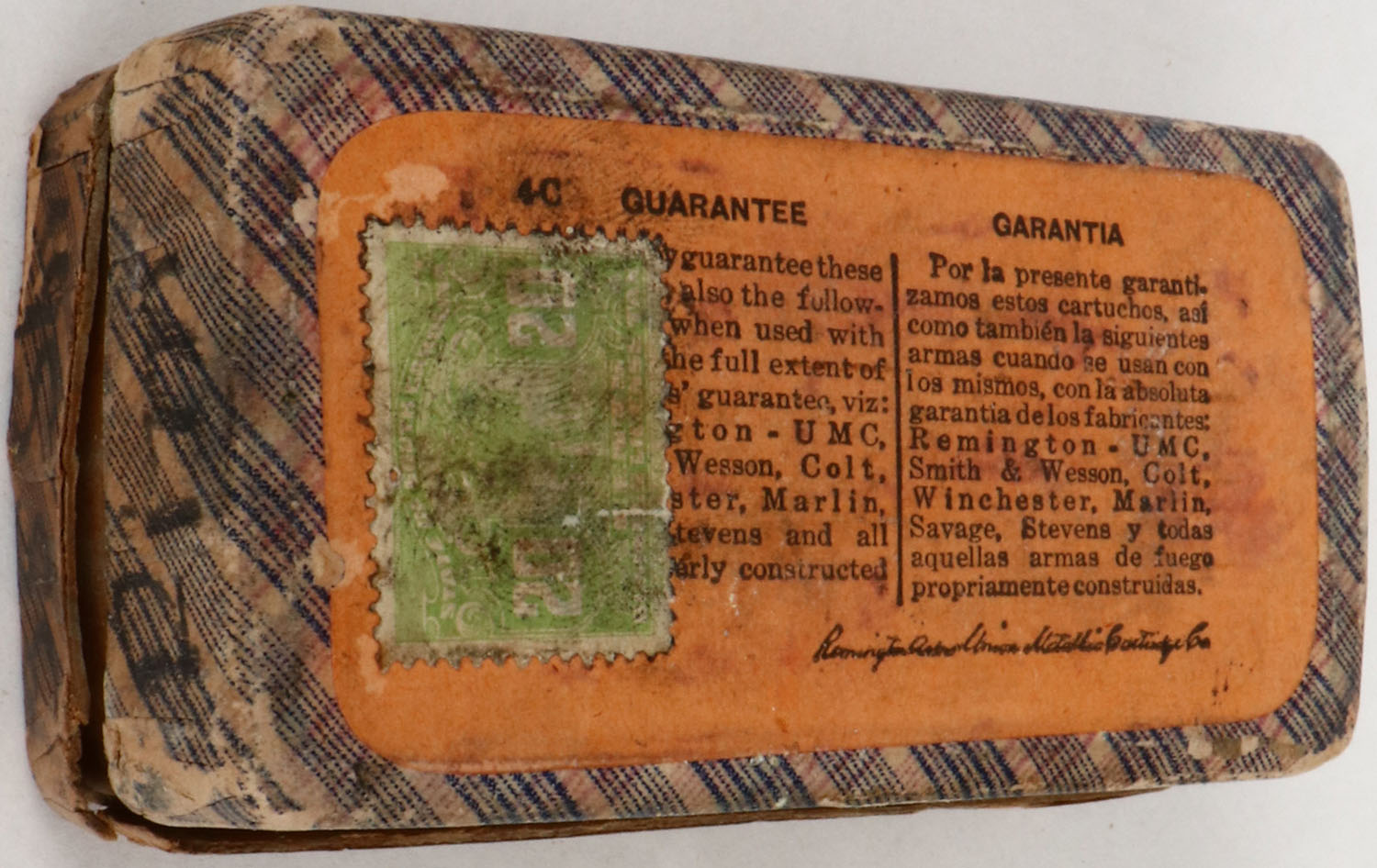 REM-UMC, .38 Short Rim Fire, 125 Grs. Bullet, Full, 2pc. Fabric box with blue top label, box is solid with very good color, age soiling, corner wear, minor edge wear, vertical seam splits to all corners of lid, right end has been written on, ammo is good to very good. Grade: Good + - Value: 20 to 80