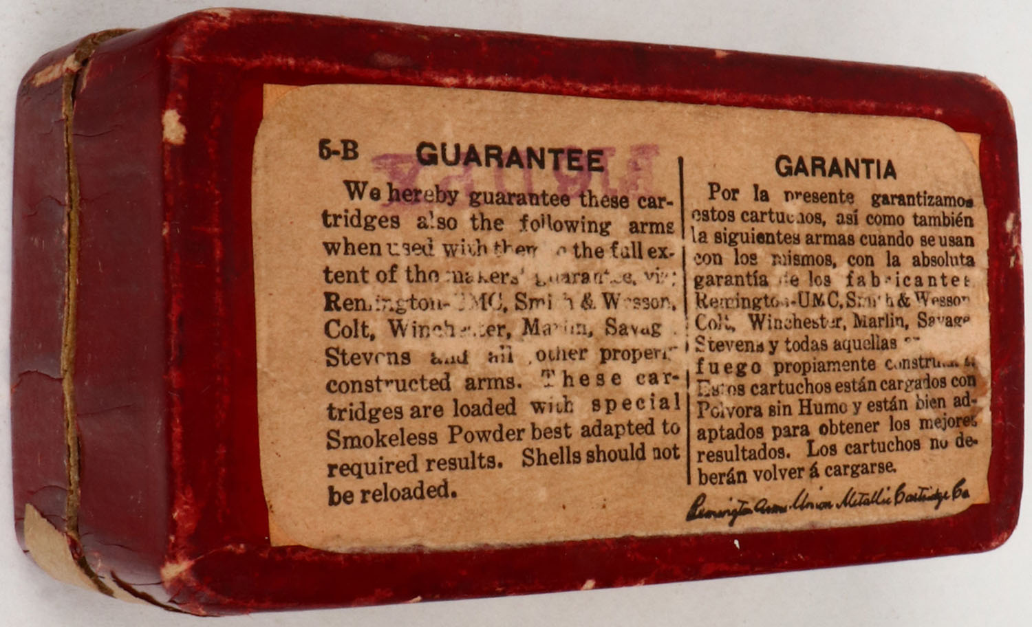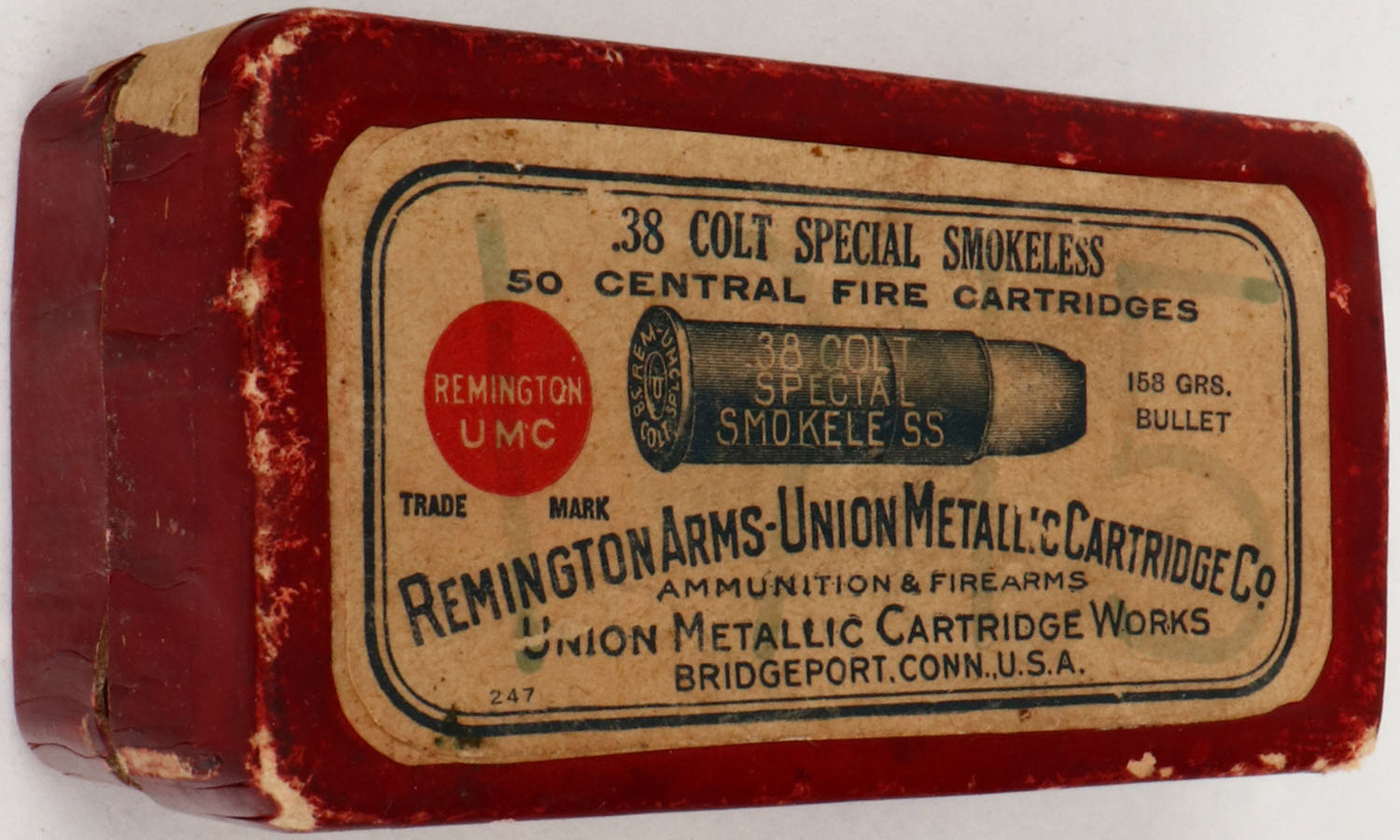 REM-UMC, .38 Colt Special Smokeless, 158 Grs. Bullet, Full, 2pc. Red box with buff top & side sealing labels, box is solid with excellent color, very minor age soiling, minor edge & corner wear, side sealing label is 20% intact, top has been written on, ammo is mostly excellent. (1414) Grade: Very Good ++ - Value: 30 to 120