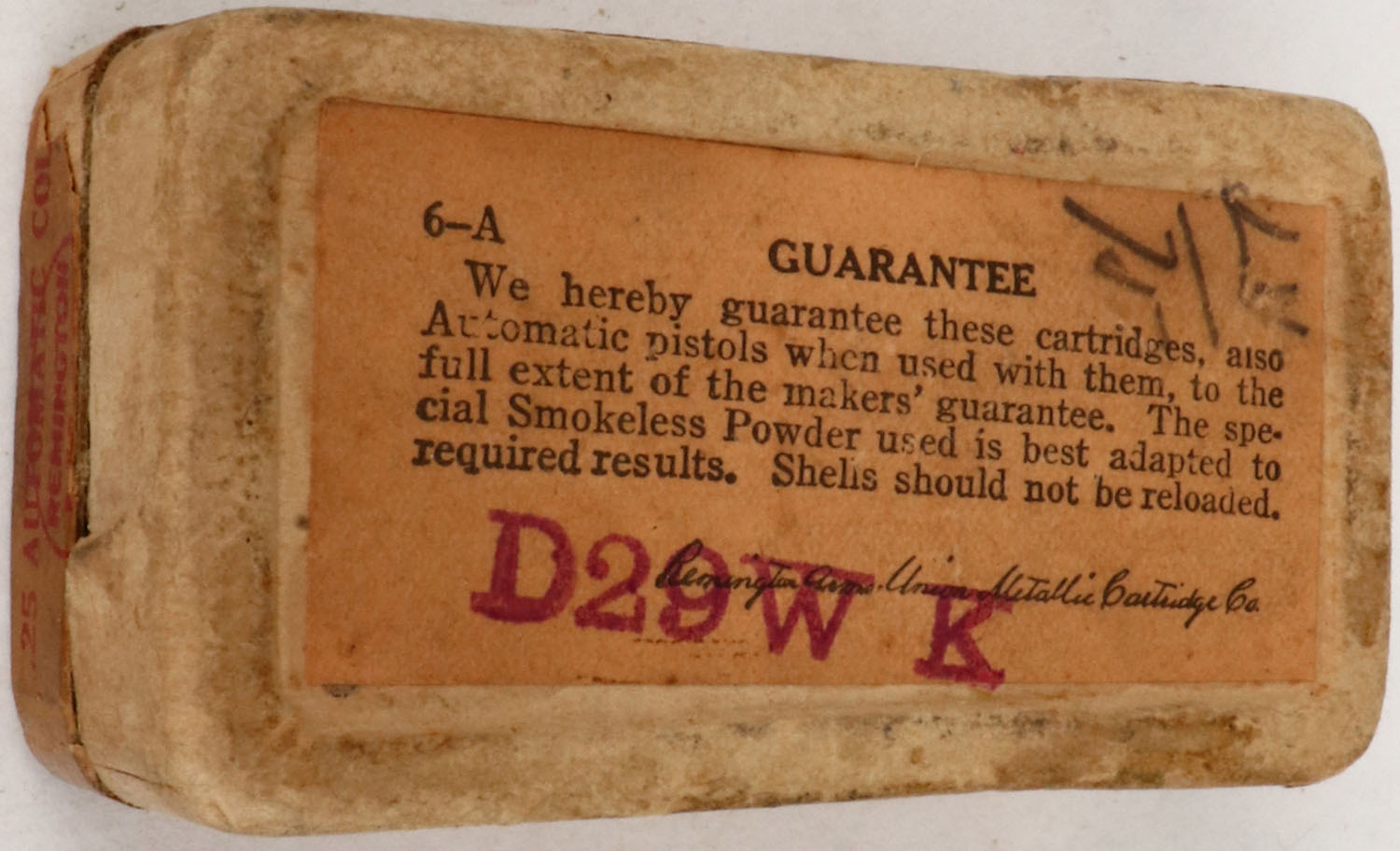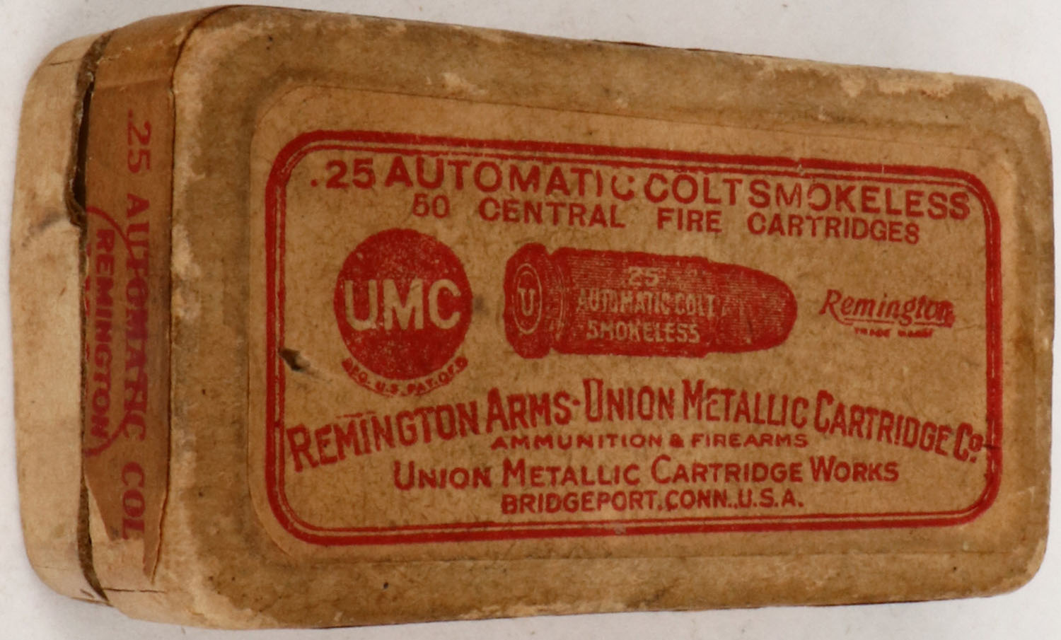 REM-UMC, .25 Automatic Colt Smokeless, Metal Cased, Full, 2pc. Buff box with buff & red labels, box is solid with excellent color, some age soiling, minor corner wear, very minor edge wear, side sealing label is 80% intact, ammo is excellent. Grade: Very Good + - Value: 20 to 80