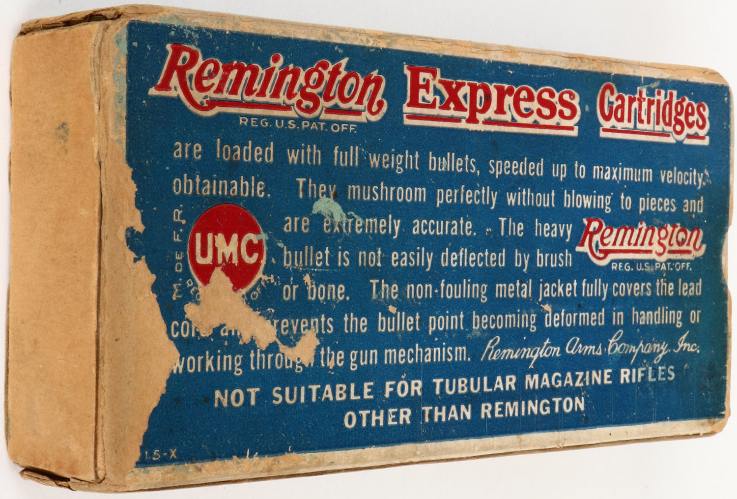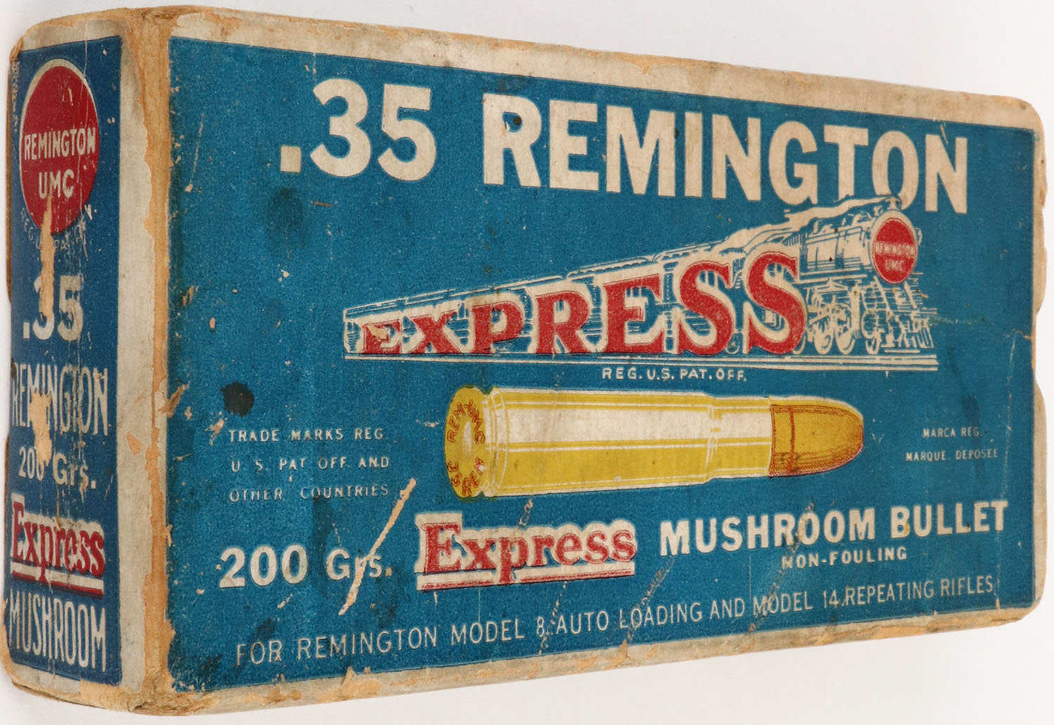 Remington, Express, .35 Remington, 200 Grs. Express Mushroom Bullet, Full, 1pc. Blue white & red box, box is solid with excellent color, minor age soiling, missing right end flap, some edge & corner wear, minor shelf wear, left end flap is solid, ammo is excellent. Grade: Very Good + - Value: 200 to 600