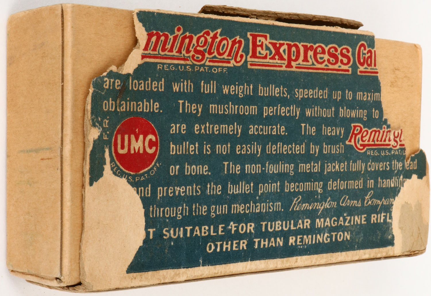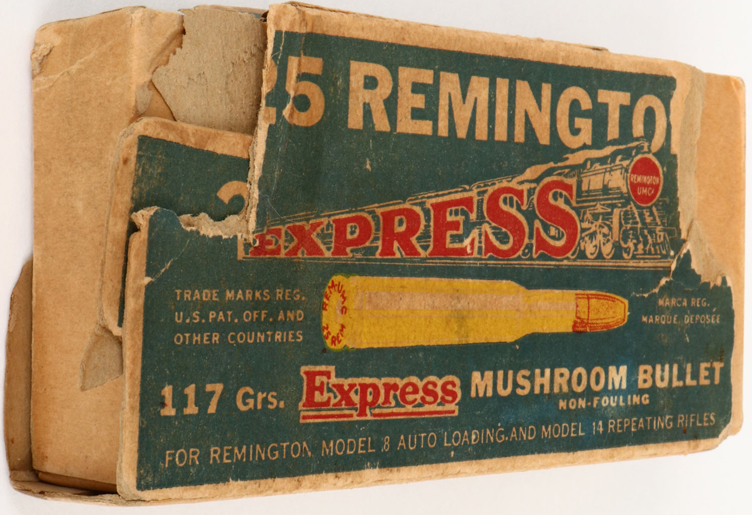 Remington, Express, .25 Remington, 117 Grs. Express Mushroom Bullet, Empty, 1pc. Blue white & red box, box is missing both end flaps, has very good color, age soiling, missing much of the back side, seam split to back edge, tear to top, some edge wear. Grade: Fair ++ - Value: 2 to 60