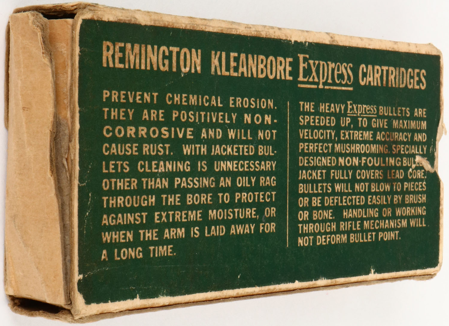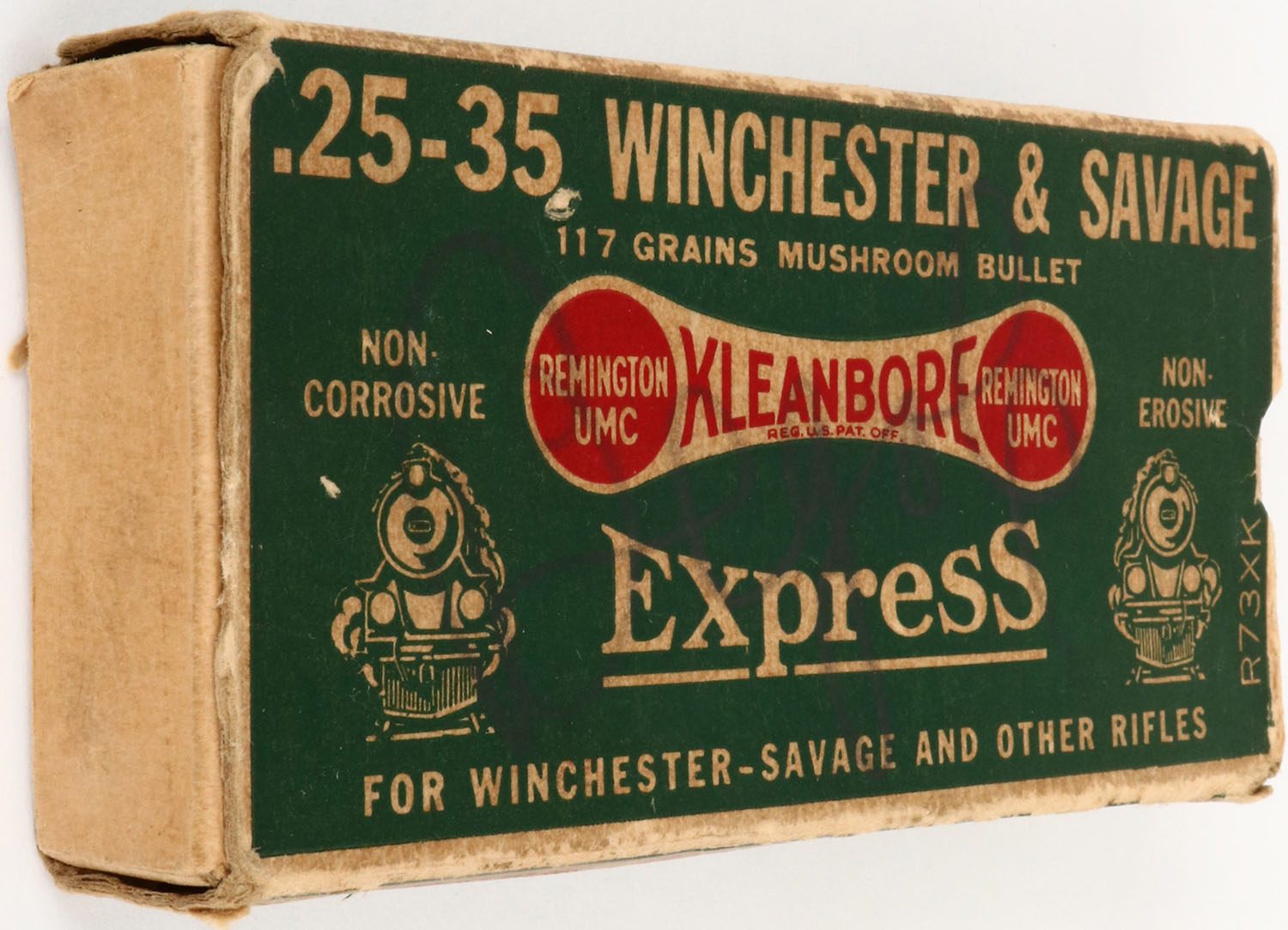 Remington Kleanbore Express, .25-35 Winchester & Savage, 117 Grains Mushroom Bullet, Partial 13rds., 1pc. Green white & red box, box is missing both end flaps, has excellent color with some age soiling, some edge & corner wear, top has been written on, ammo is excellent. Grade: Good + - Value: 20 to 120