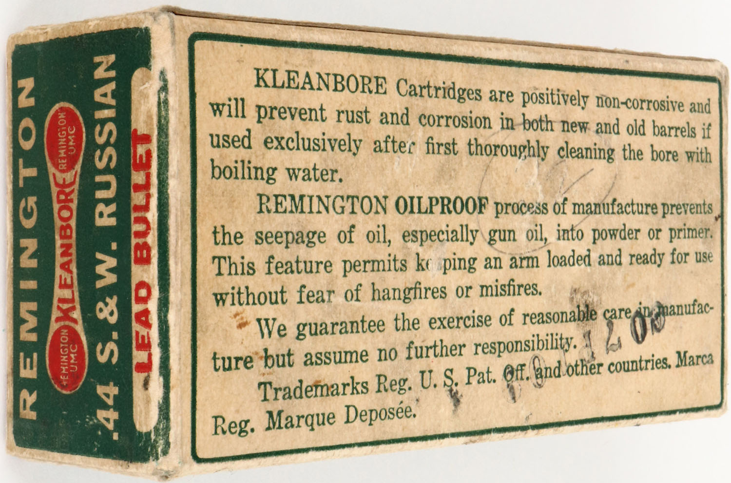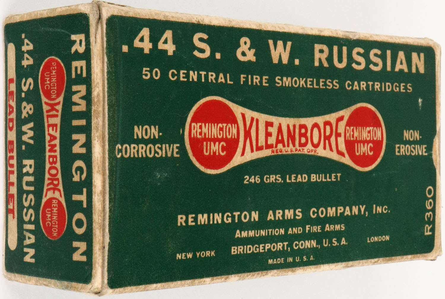 Remington, Kleanbore, .44 S&W Russian, 246 Grs. Lead Bullet, Partial 49rds., 1pc. Green white & red dog bone box, box is solid with excellent color, minor age soiling, very minor edge & corner wear, end flaps are solid, ammo is excellent. Grade: Excellent - Value: 20 to 80