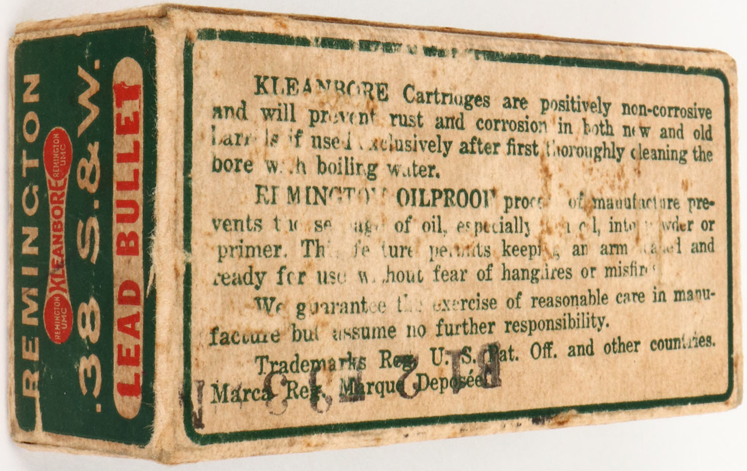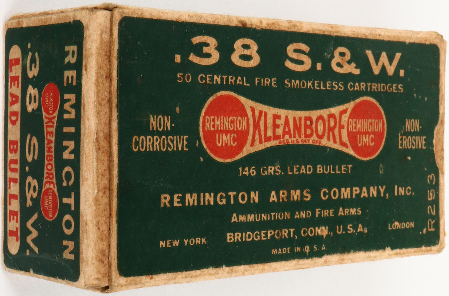 Remington, Kleanbore, .38 S&W, 146 Grs. Lead Bullet, Full, 1pc. Green white & red dog bone box, box is solid with excellent color, age soiling, very minor corner wear, edges are mostly crisp, end flaps are solid, ammo is excellent. (560) Grade: Very Good ++ - Value: 20 to 80