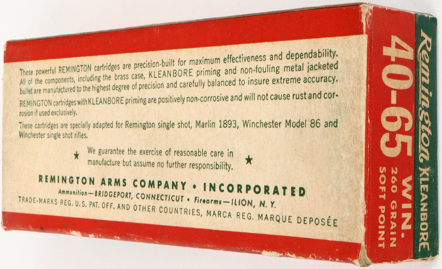 Remington, Kleanbore, .40-65 Winchester, 260 Grain Soft Point Bullet, Partial 10rds., 1pc. Green red & white box, box is solid with excellent color, very minor age soiling & corner wear, edges are mostly crisp, end flaps are solid, ammo is excellent. Grade: Excellent - Value: 10 to 100