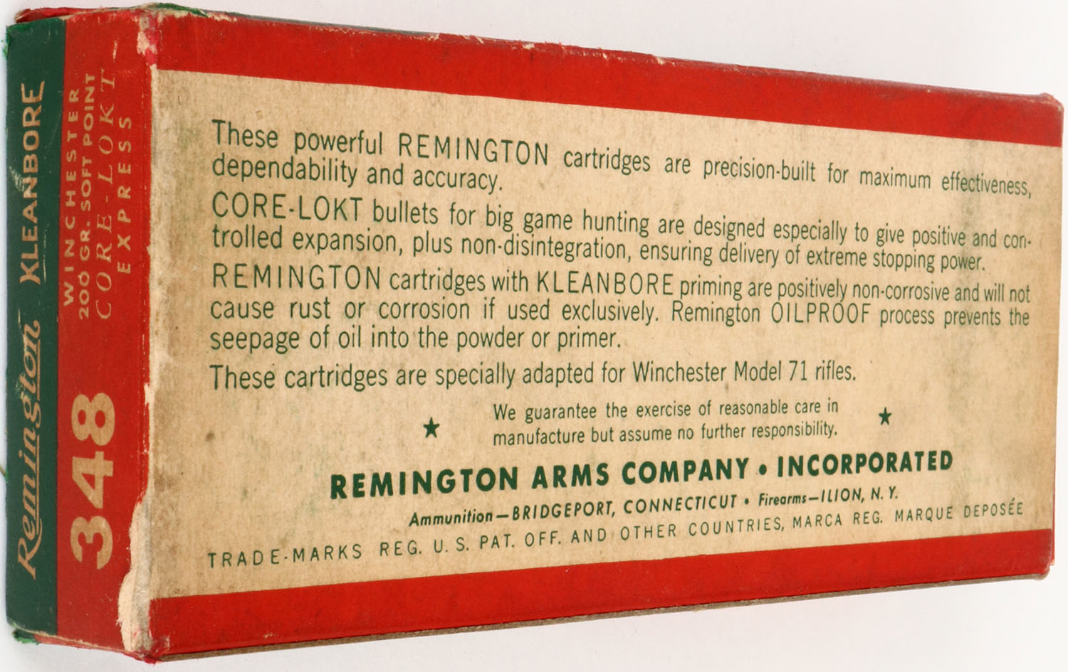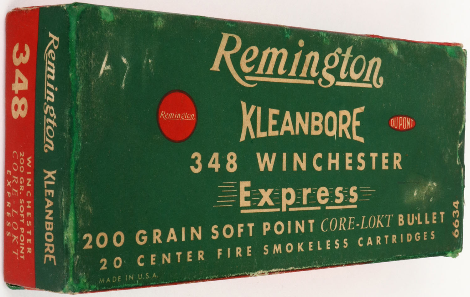 Remington, Kleanbore Express, .348 Winchester, 200 Grain Soft Point Core-Lokt Bullet, Full, 1pc. Green red & white box, box is solid with excellent color, some age soiling & shelf wear, minor edge & corner wear, box has been color repaired on corners & edges, end flaps are solid, ammo is excellent. Grade: Very Good ++ - Value: 50 to 150