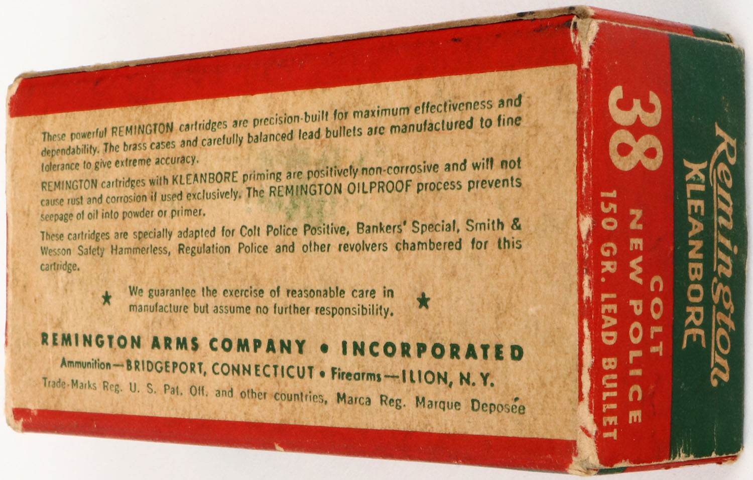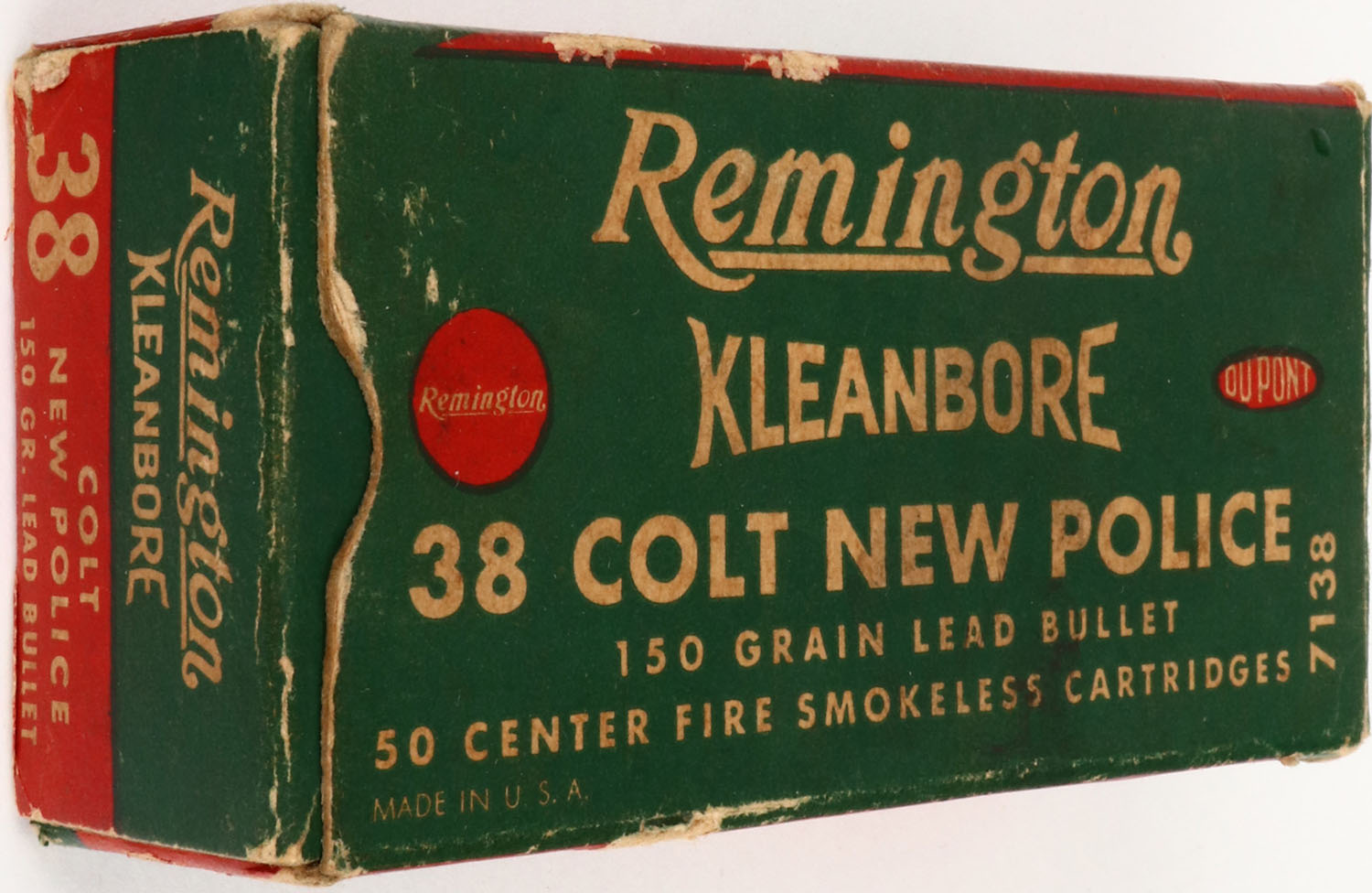 Remington, Kleanbore, .38 Colt New Police, 150 Grain Lead Bullet, Full, 1pc. Green red & white box, box is solid with some age soiling, minor edge & corner wear, end flaps are solid, ammo is excellent. (1516) Grade: Very Good ++ - Value: 20 to 60