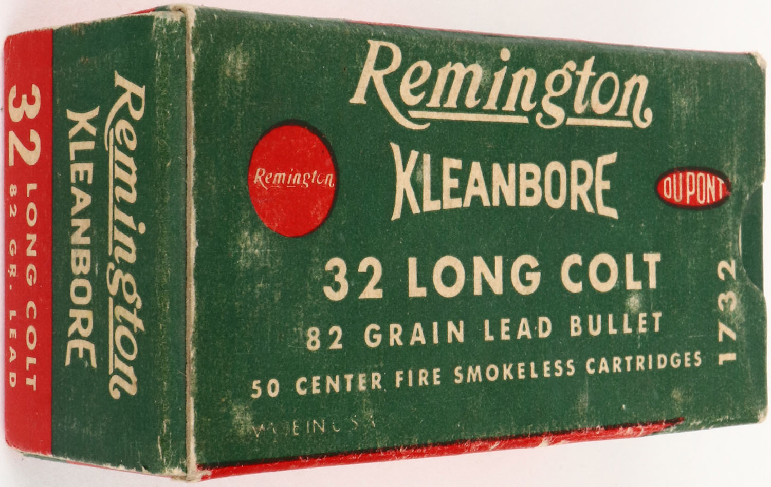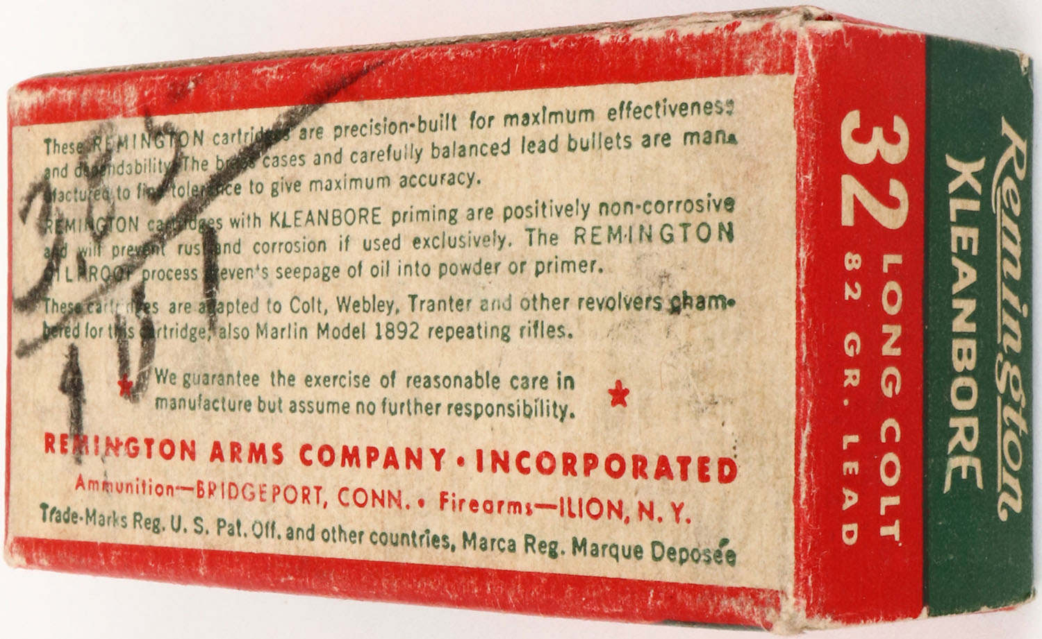 Remington, Kleanbore, .32 Long Colt, 82 Grain Lead Bullet, Full, 1pc. Green red & white box, box is solid with excellent color, very minor age soiling & shelf wear, very minor corner wear, edges are mostly crisp, end flaps are solid, ammo is excellent to minty. Grade: Excellent - Value: 50 to 100