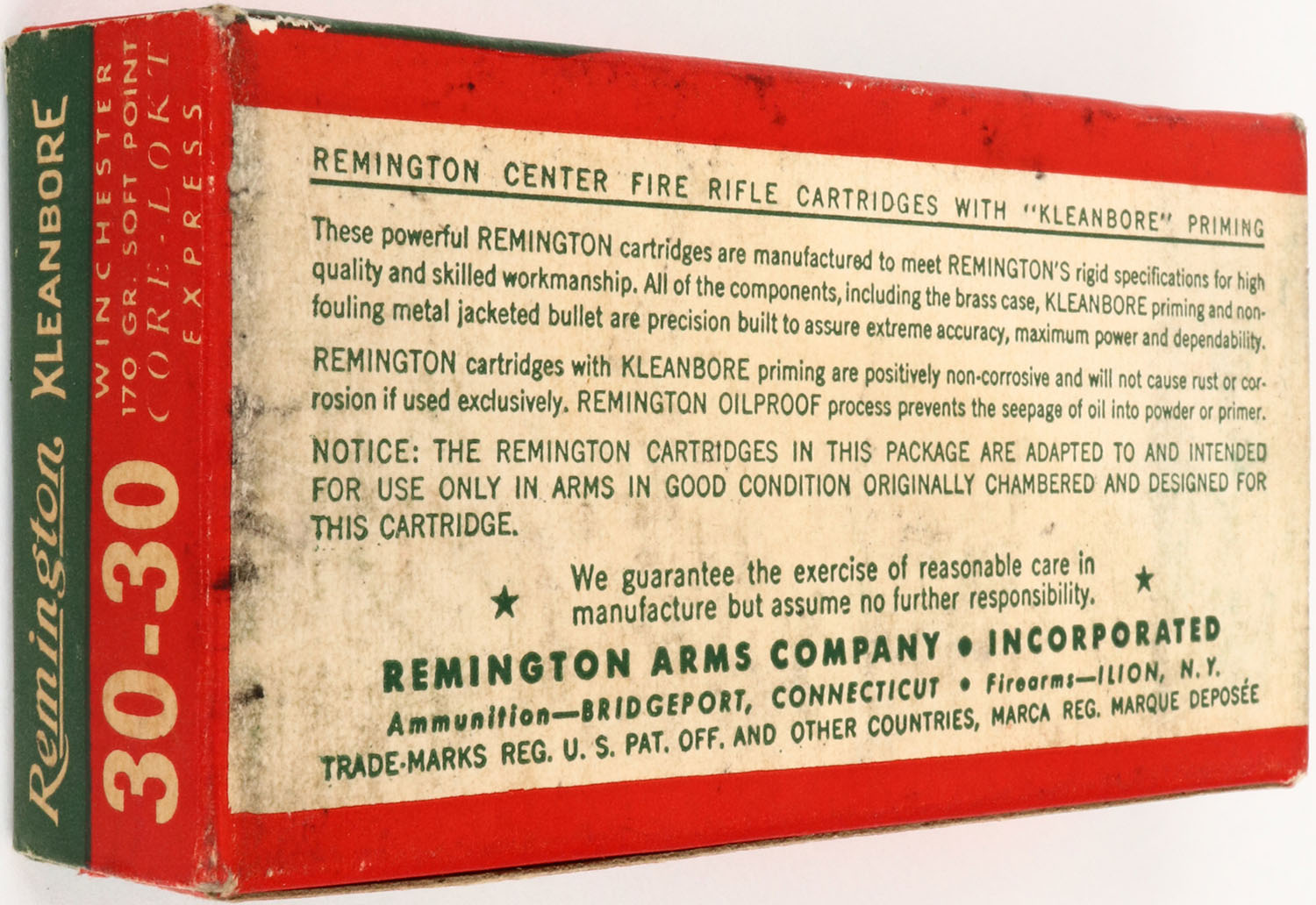 Remington, Kleanbore Express, .30-30 Winchester, 170 Grain Soft Point Core-Lokt Bullet, Full, 1pc. Green red & white box, box is solid with excellent color, very minor age soiling & corner wear, edges are mostly crisp, end flaps are solid, ammo is excellent. Grade: Excellent - Value: 20 to 60