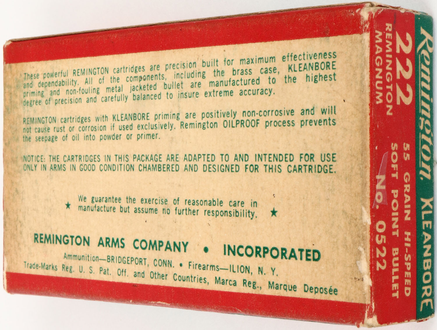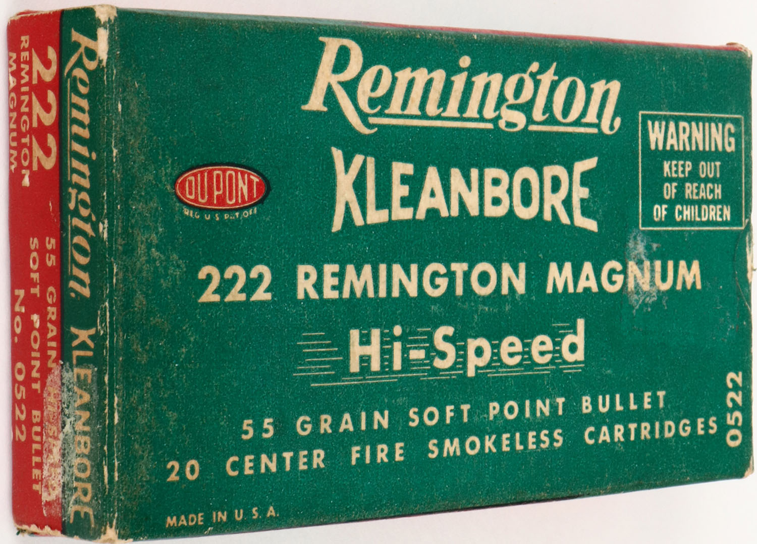 Remington, Kleanbore Hi-Speed, .222 Remington Magnum, 55 Grain Soft Point Bullet, Full, 1pc. Green red & white box, box is solid with excellent color, very minor age soiling, minor shelf & corner wear, edges are crisp, end flaps are solid, ammo is excellent. Grade: Very Good ++ - Value: 10 to 40