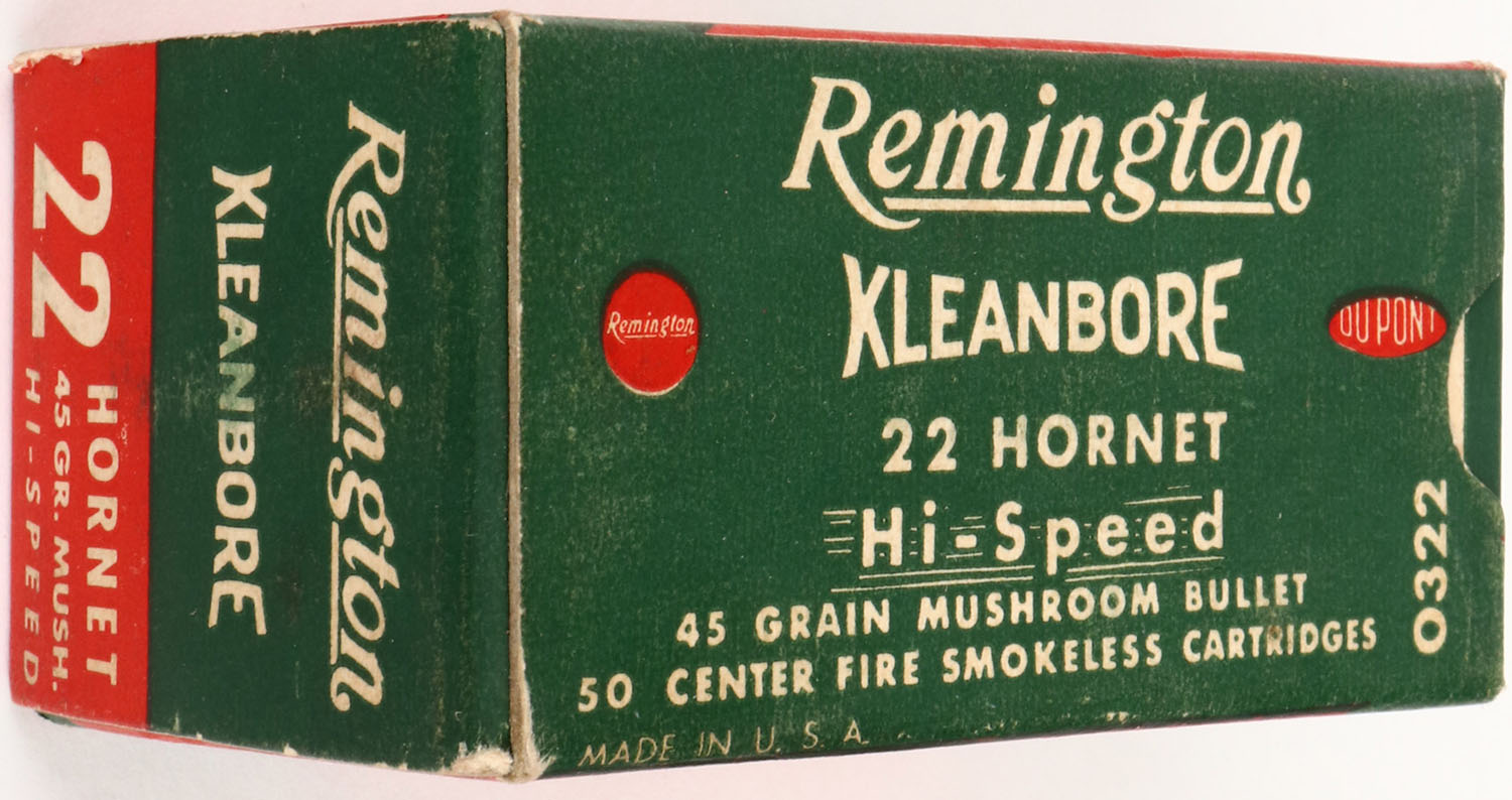 Remington, Kleanbore Hi-Speed, Full, 1pc. Green red & white box, box is solid with excellent color, very minor corner wear, edges are crisp, end flaps are solid, ammo is excellent. Grade: Excellent - Value: 40 to 80
