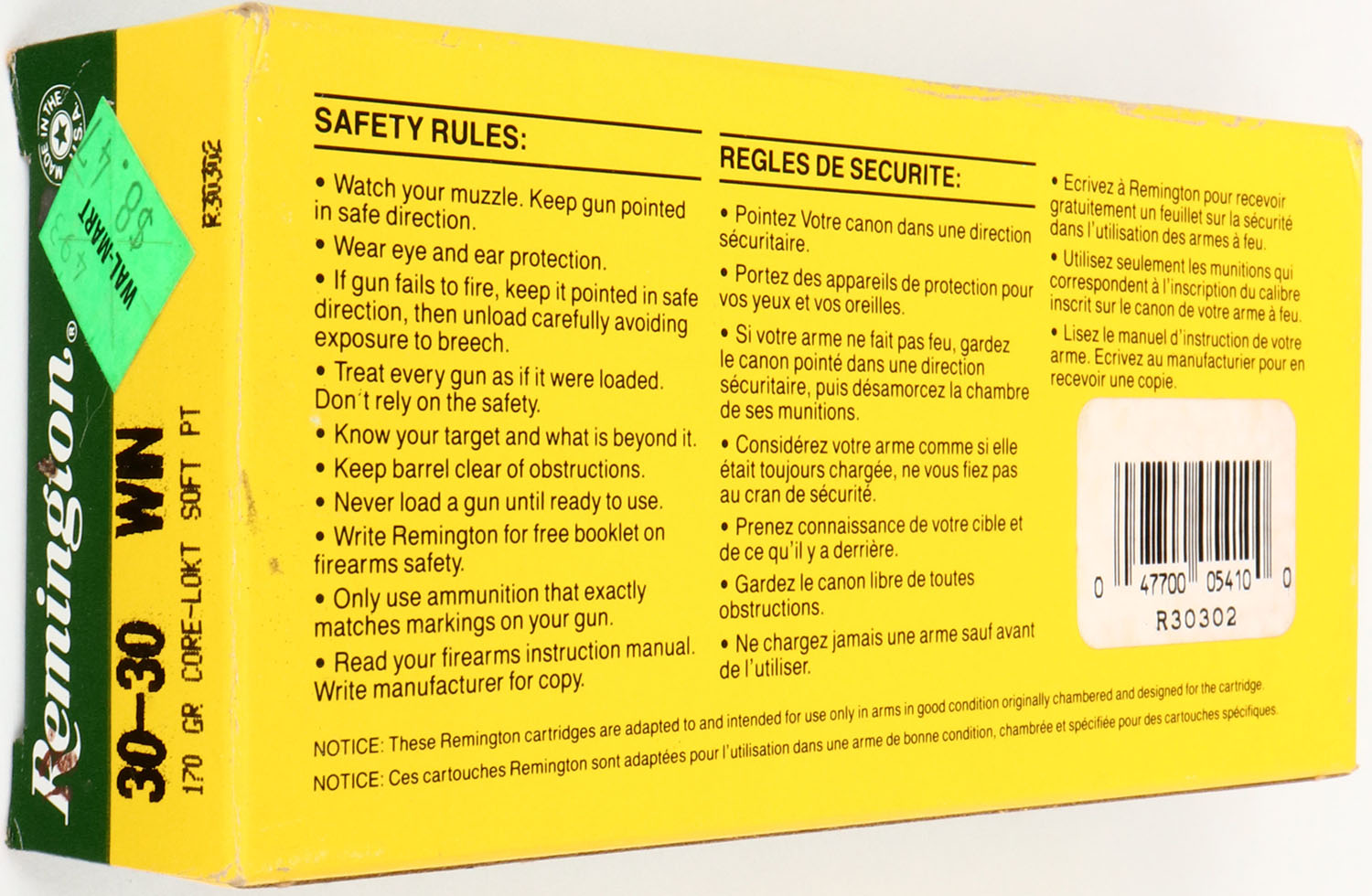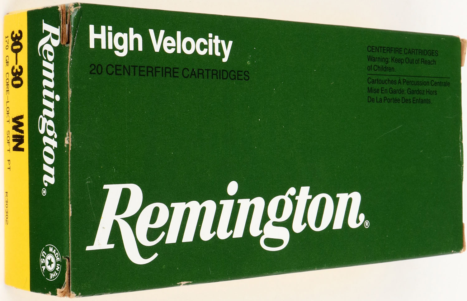 Remington, High Velocity, .30-30 Win. 170 Gr. Core-Lokt Soft Pt., Full, 1pc. Green yellow & white box, box is solid with minty color, very minor edge & corner wear, end flaps are solid, ammo is minty. Grade: Excellent - Value: 20 to 60