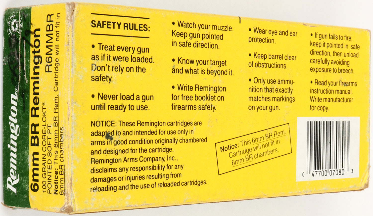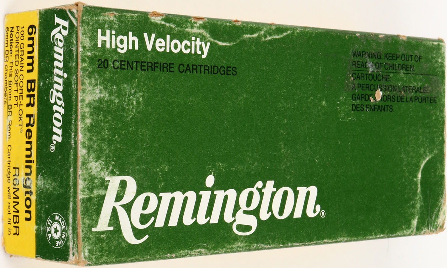 Remington, High Velocity , 6mm BR Remington, 100 Grain Core-Lokt Pointed Soft Pt., Full, 1pc. Green yellow & white box, box is solid with excellent color, corner wear, some edge & shelf wear, right end has been written on, end flaps are solid, ammo is excellent. Grade: Very Good ++ - Value: 20 to 60