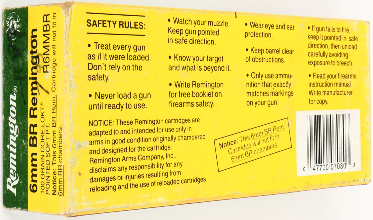 Remington, High Velocity, 6mm BR Remington, 100 Grain Core-Lokt Pointed Soft Pt., Full, 1pc. Green yellow & white box, box is solid with excellent color, shelf wear, some edge & corner wear, end flaps are solid, right end flap has been written on, ammo is excellent. Grade: Very Good ++ - Value: 20 to 60