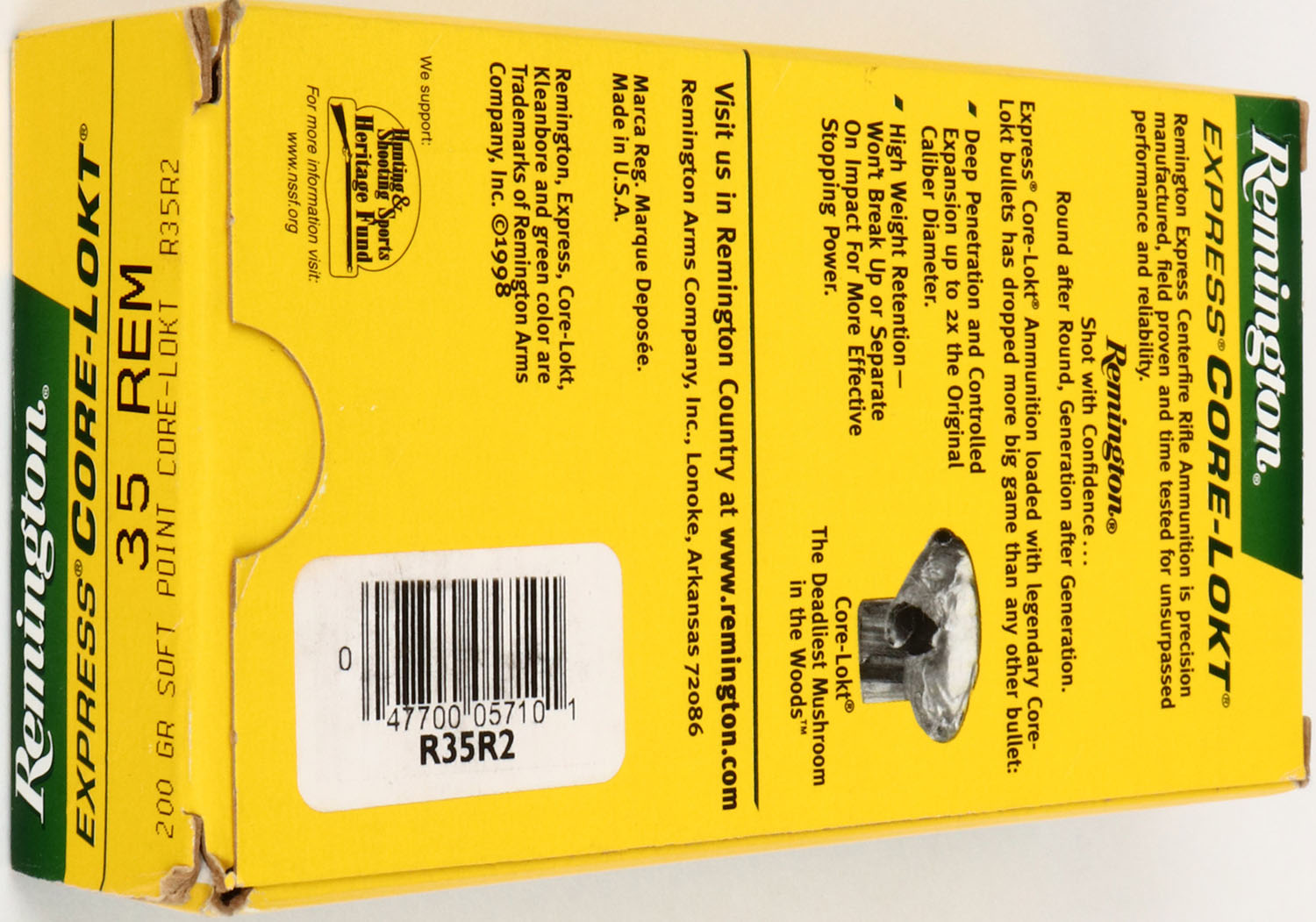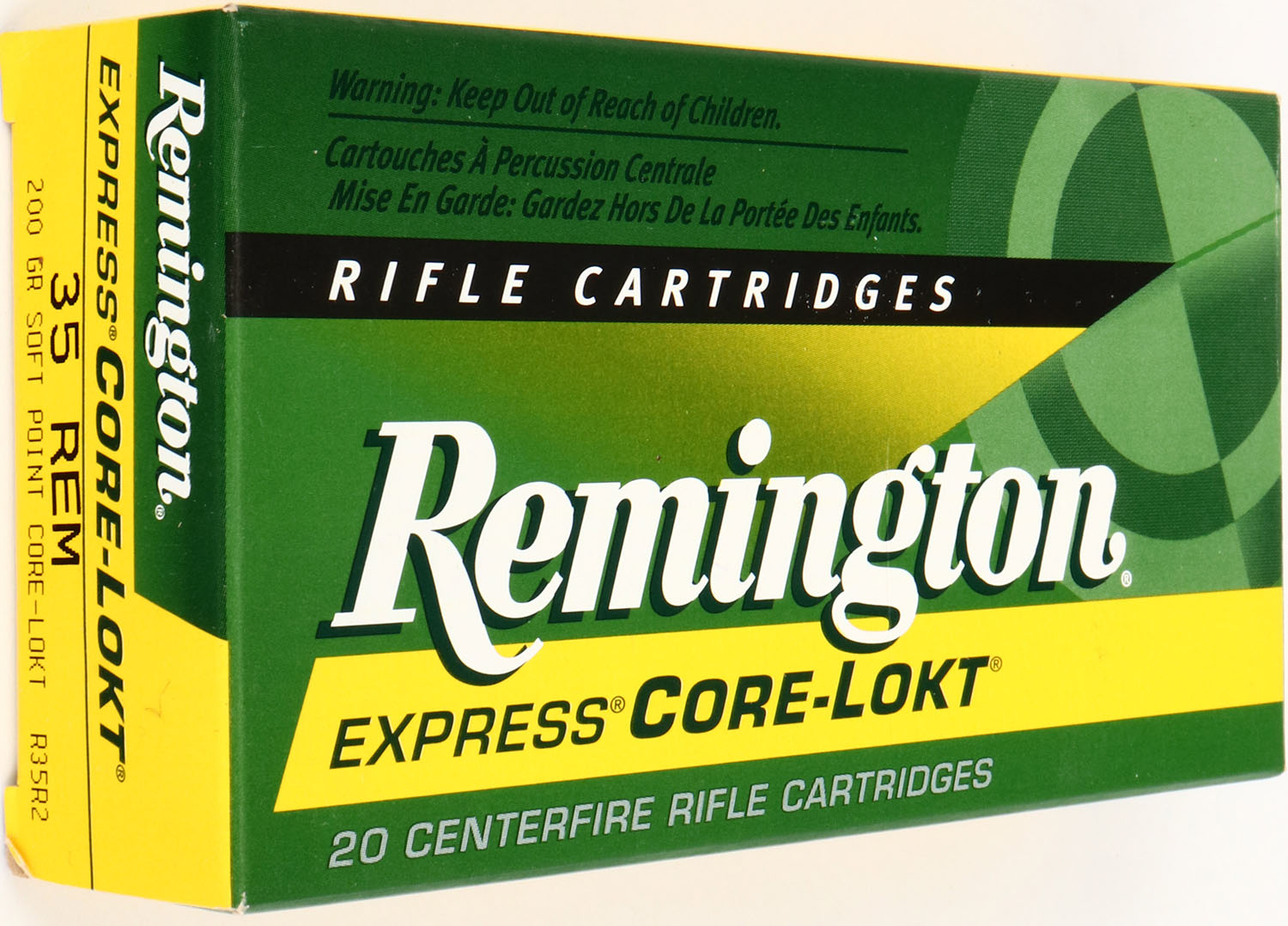 Remington, Express Core-Lokt, .35 Rem., 200 Gr. Soft Point Core-Lokt, Full, 1pc. Green yellow & white box, box is solid with minty color, very minor corner wear, edges are crisp, end flaps are solid, ammo is excellent. Grade: Excellent + - Value: 30 to 90