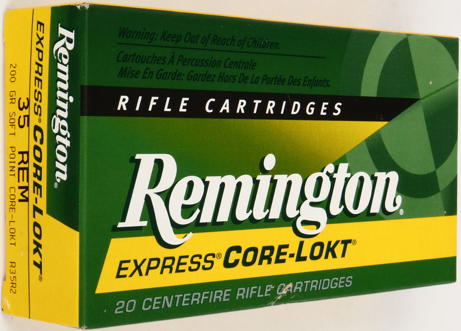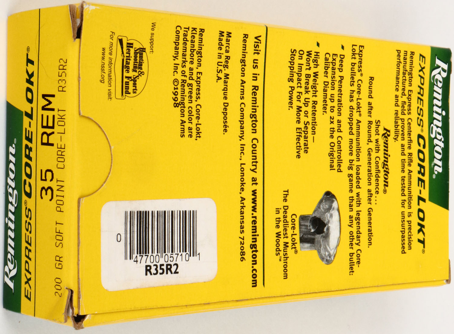 Remington, Express Core-Lokt, .35 Rem., 200 Gr. Soft Point Core-Lokt, Full, 1pc. Green yellow & white box, box is solid with minty color, very minor corner wear, edges are crisp, end flaps are solid, ammo is excellent. Grade: Excellent + - Value: 30 to 90