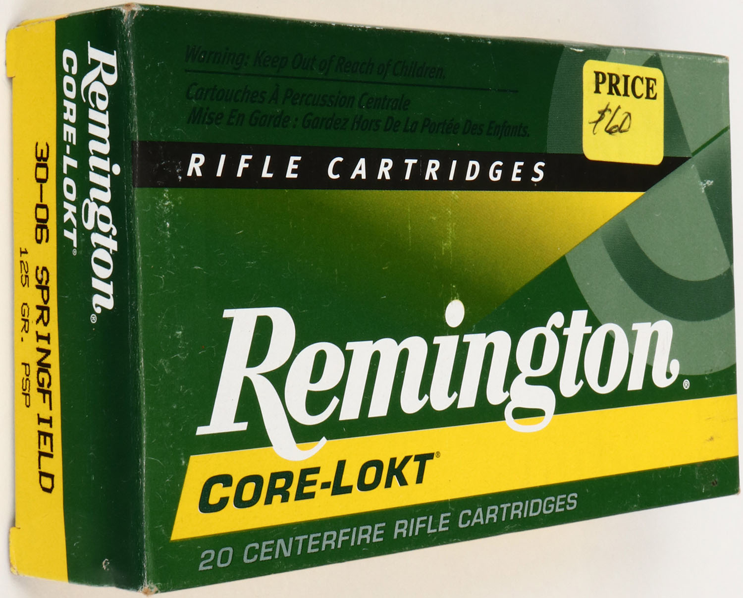 Remington, Core-Lokt, .30-06 Springfield, 125 Gr. Core-Lokt PSP, Full, 1pc. Green yellow & white box, box is solid with excellent to minty color, very minor shelf & corner wear, edges are crisp, end flaps are solid, ammo is excellent. Grade: Excellent + - Value: 20 to 60
