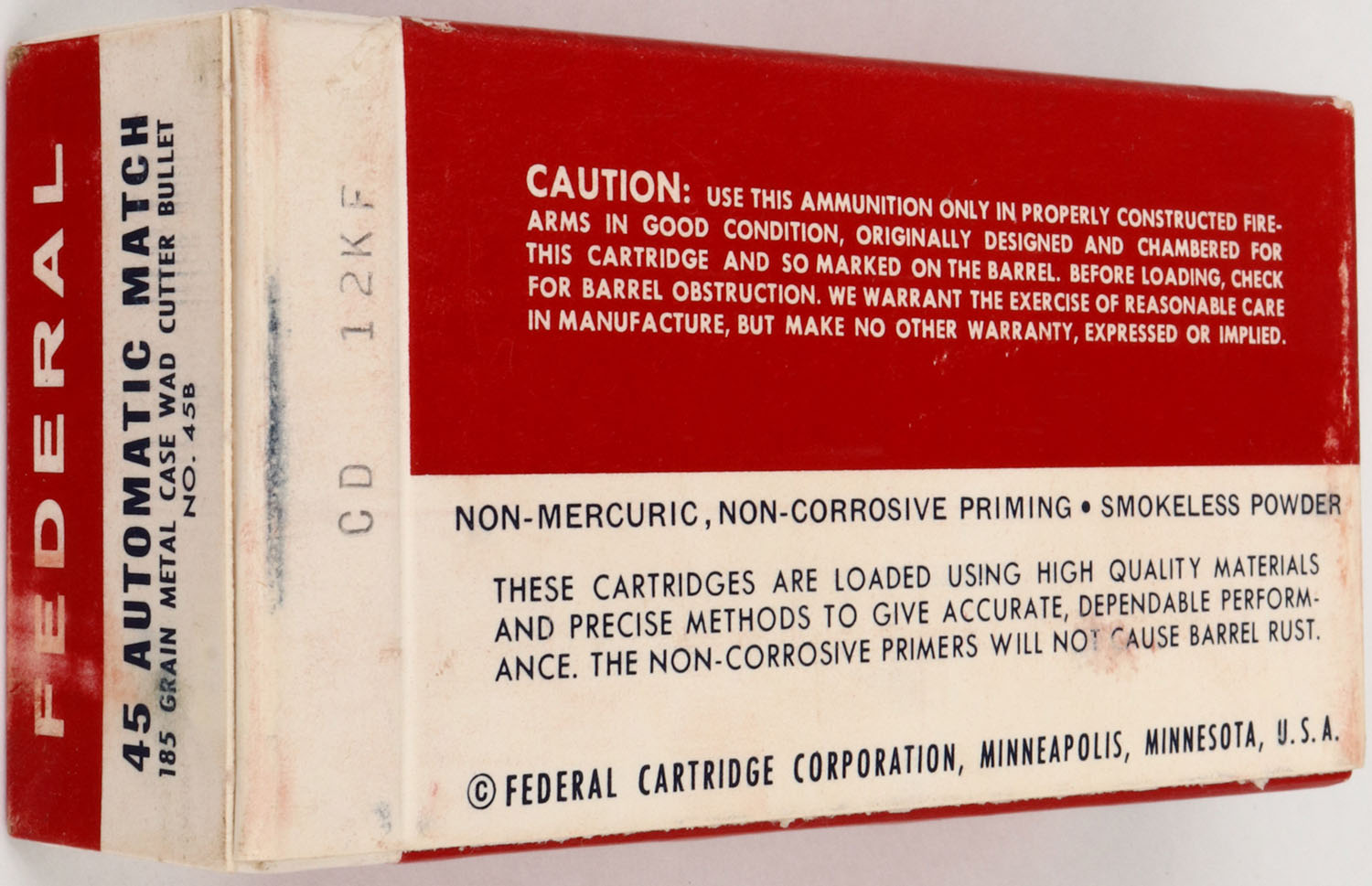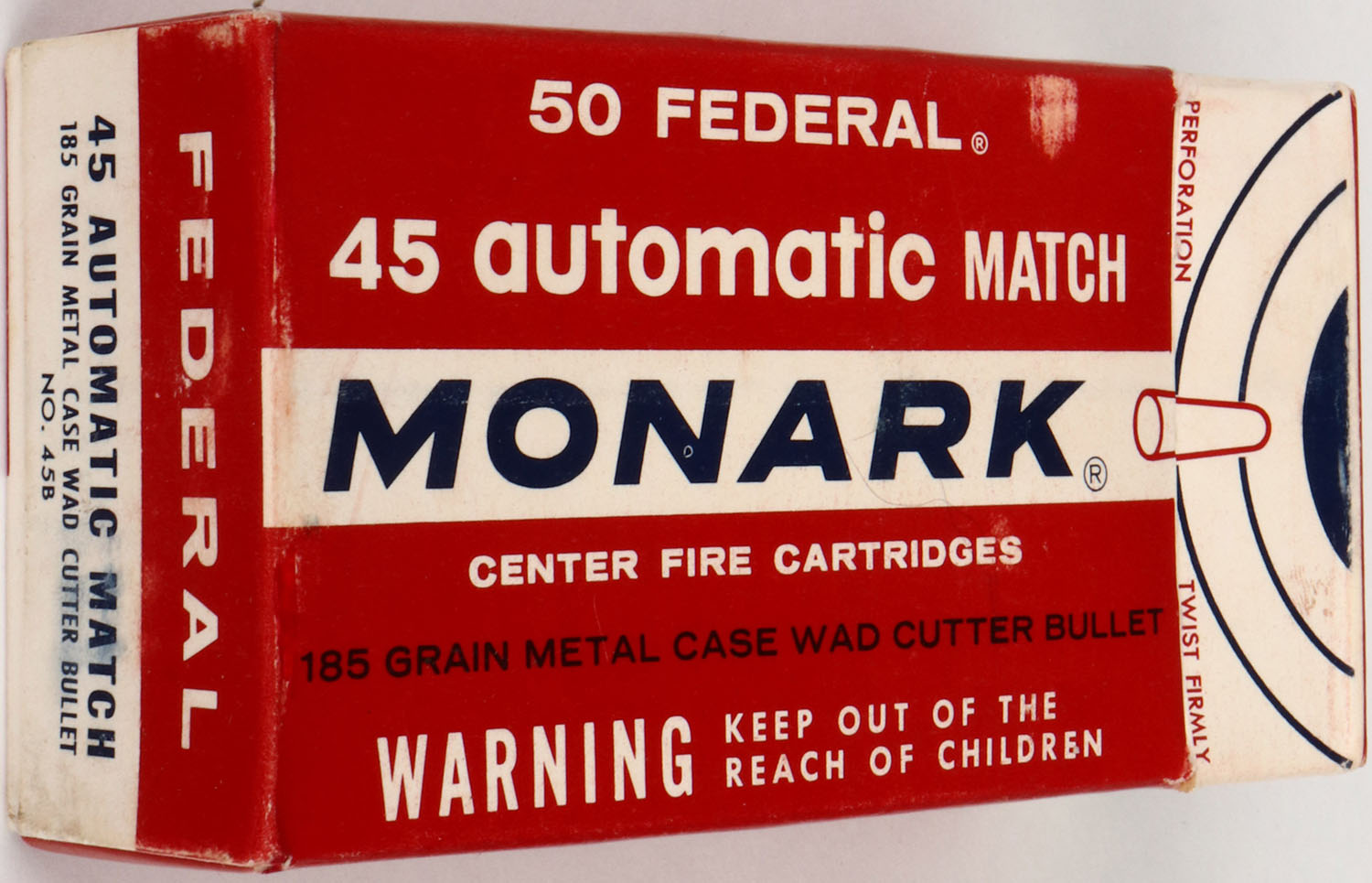 Federal, Monark, .45 Automatic Match, 185 Grain Metal Case Wad Cutter Bullet, FULL & SEALED, 1pc. Red white & black box, box is solid with excellent color, very minor shelf wear, corners are mostly sharp, edges are crisp. Grade: Excellent + - Value: 30 to 90