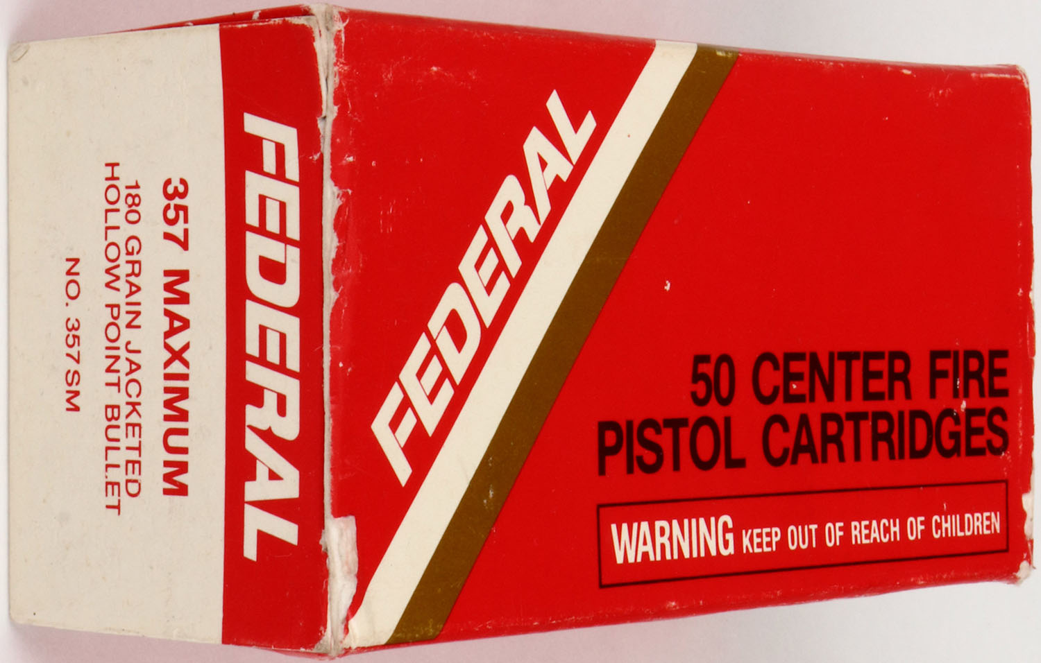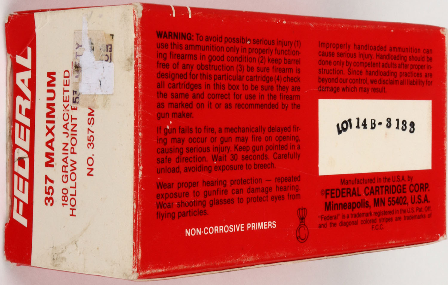 Federal, .357 Maximum, 180 Grain Jacketed Hollow Point Bullet, Full, 1pc. Red & white box, box is solid with excellent to minty color, some edge & corner wear, end flaps are solid, ammo is excellent. Grade: Excellent - Value: 30 to 90