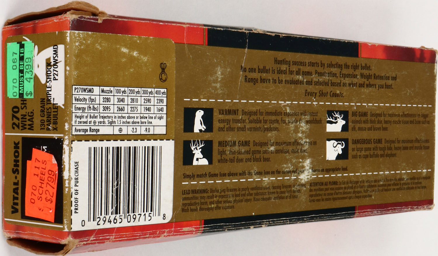 Federal, Premium, Vital-Shok, .270 WSM, 130 Grain Barnes Triple-Shock X-Bullet, Full of mixed H/S & Bullets, 1pc. Red & black box, box is solid with excellent color, some corner wear, very minor shelf & edge wear, top flap is solid, ammo is excellent. Grade: Excellent - Value: 10 to 50