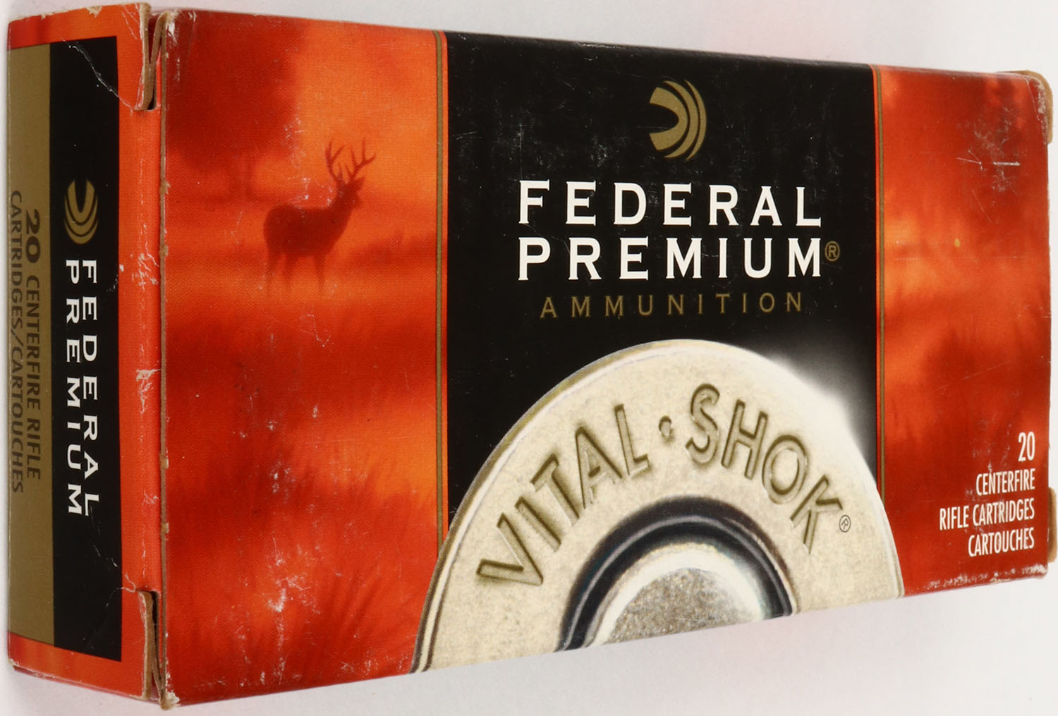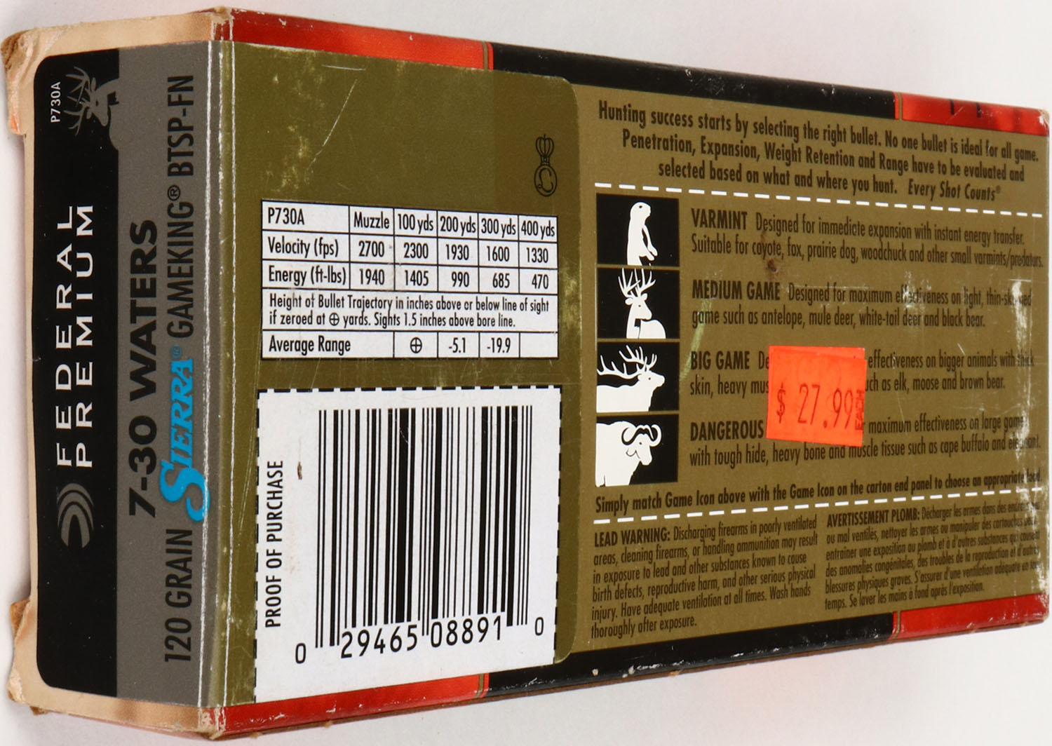 Federal, Premium, Vital-Shok, 7-30 Waters, 120 Grain Sierra Gameking BTSP-FN, Full, 1pc. Red & black box, box is solid with excellent color, some corner wear, very minor shelf wear, edges are mostly crisp, end flaps are solid, ammo is excellent to minty. Grade: Excellent - Value: 20 to 60