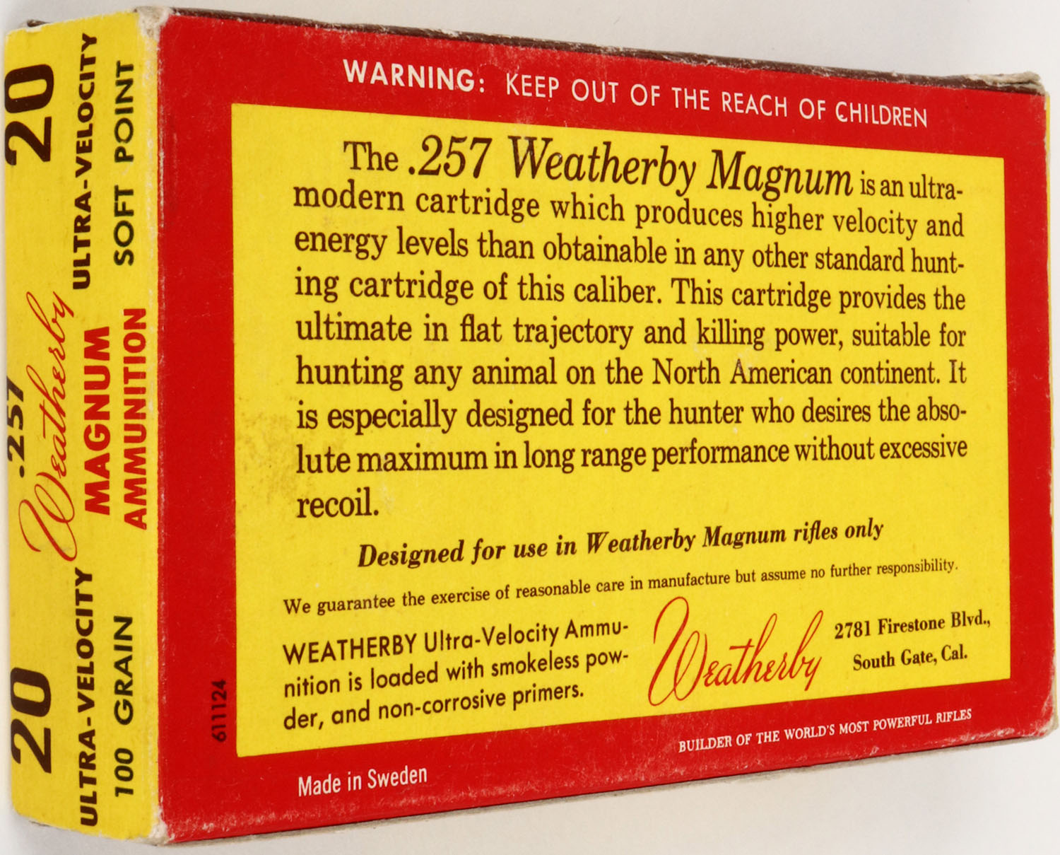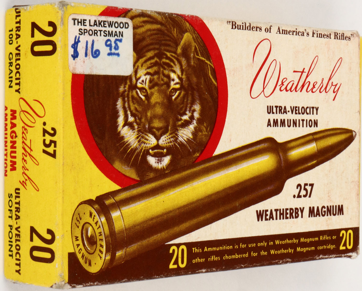 Weatherby, Ultra-Velocity Ammunition, .257 Weatherby Magnum, 100 Grain Soft Point, Full, 1pc. White brown & yellow tiger box, box is solid with excellent color, very minor age soiling & edge wear, some corner wear, sticker on top, end flaps are solid, ammo is excellent. Grade: Excellent - Value: 40 to 120