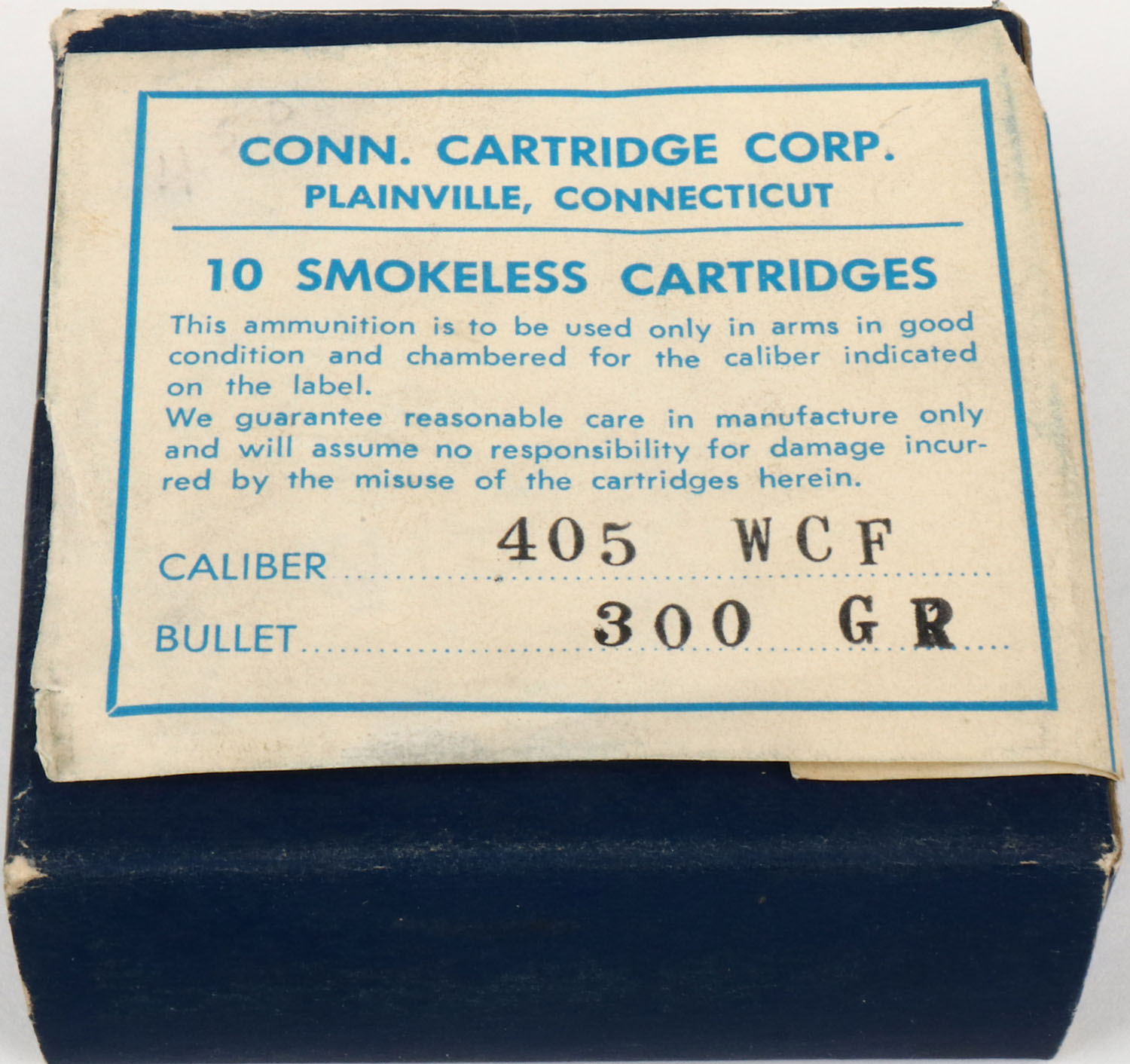 Conn. Cartridge Corp., .405 W.C.F., 300 Grain, Smokeless, 1pc. Blue box with white label, box is solid with excellent to minty color, label has been removed but is inside the box, very minor corner wear, edges are crisp, end flaps are solid, ammo is excellent. Grade: Very Good + - Value: 10 to 100