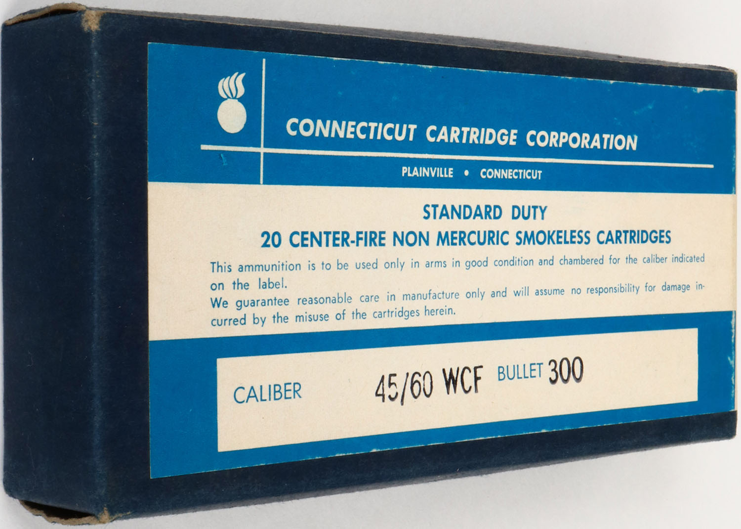 Conn. Cartridge Corp., 45/60 WCF, 300 Grain, Smokeless, 1pc, Full, blue box with white label & blue/black print, box is solid with excellent color, rub marks, light corner wear, edges are crisp, end flaps are solid, ammo is excellent. Grade: Excellent - Value: 50 to 250