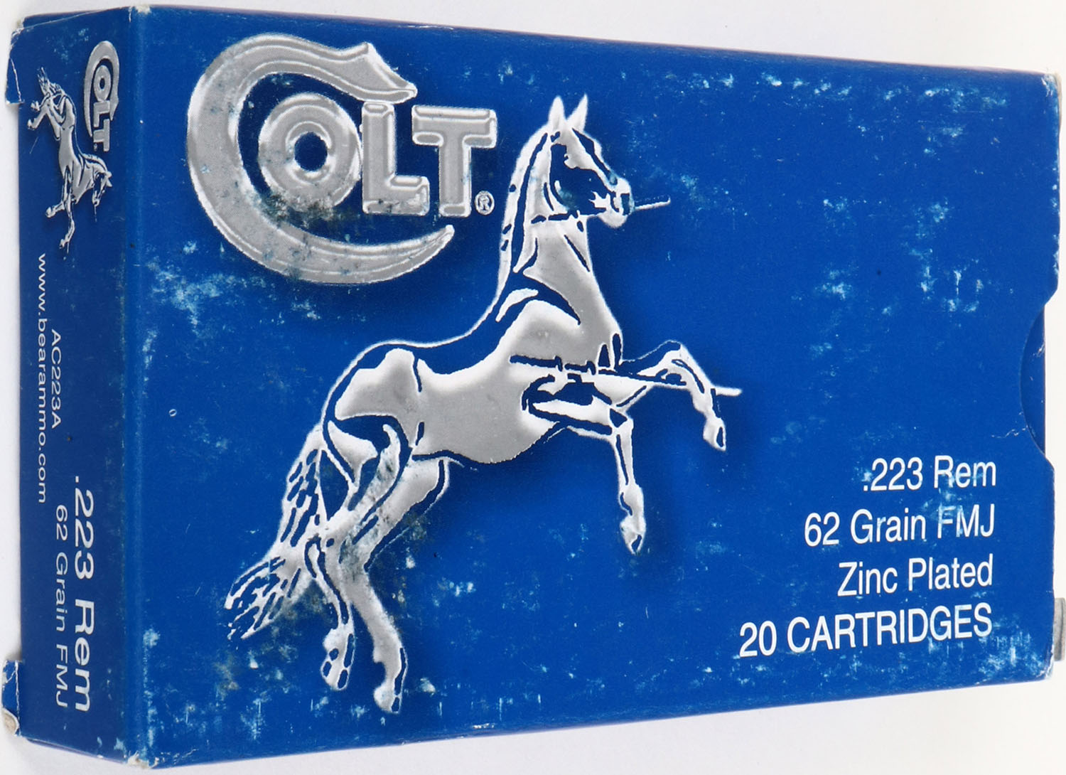 Colt, .223 Rem, 62 Grain FMJ, Zinc Plated case, 1pc, Full, blue box is solid with very good color, rub marks, edges are crisp, end flaps are solid with light wear, ammo is excellent. Grade: Very Good ++ - Value: 10 to 30