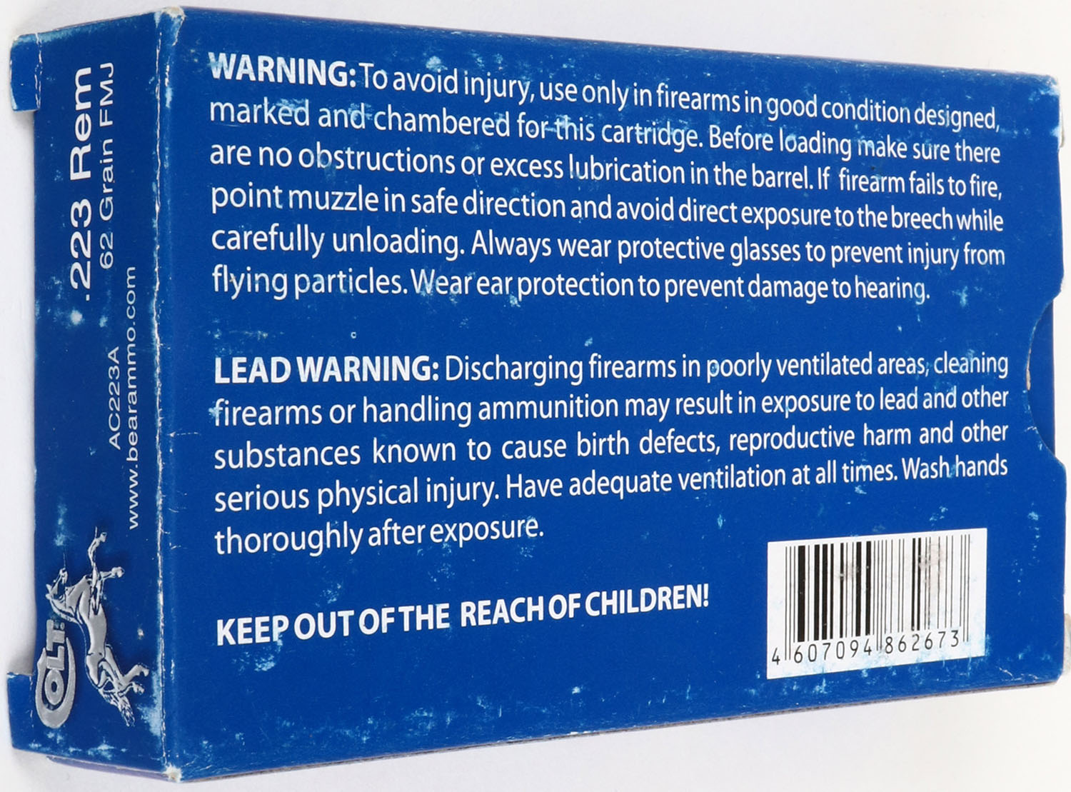 | Colt, .223 Rem, 62 Grain FMJ, Zinc Plated case, 1pc, Full, blue ...