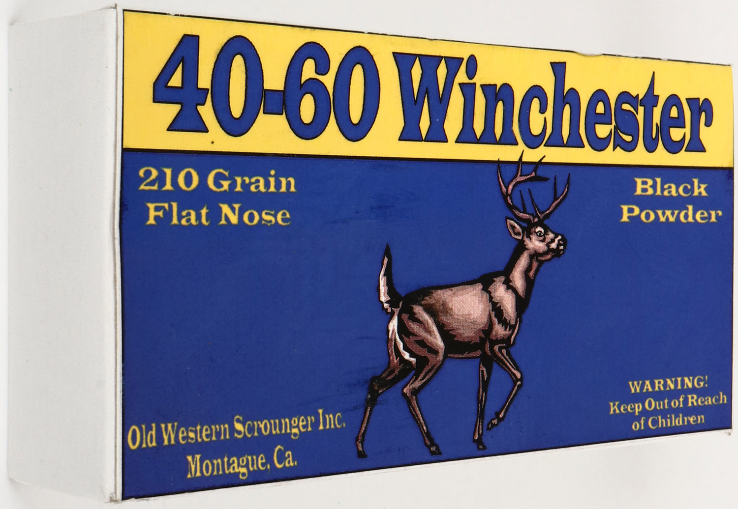 Old Western Scrounger Inc., 40-60 Winchester, 210 Gr. Flat Nose, Black Powder, 1pc, Full, white box with blue/yellow label, box is solid with excellent color, light rub marks crisp edges & solid end flaps, ammo is excellent. Grade: Excellent + - Value: 50 to 150