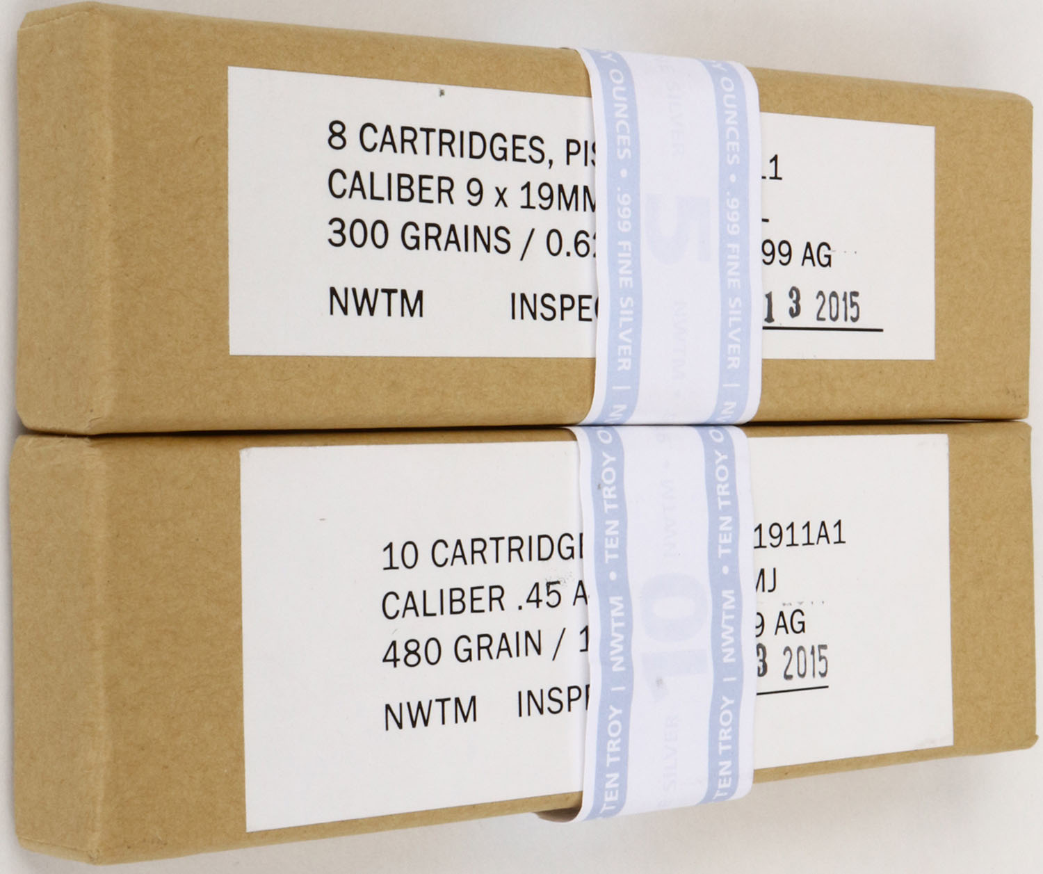 NWTM, 2 box's of inert silver bullets one with 8 Rds. 9mm Cartridges that are made of .999 Fine silver, 0.625 Troy ounce/ 300 Grains, one box of 10 Rds. of 45 acp 1 Troy Ounce/480 Grains. Grade: Excellent - Value: 40 to 120