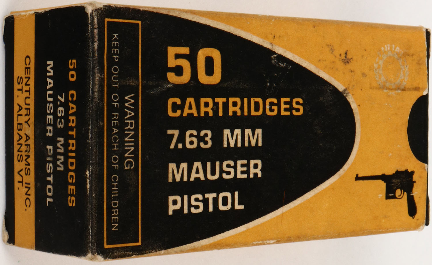 Century Arms Inc. 7.63 MM Mauser Pistol, 1pc, Full, yellow box with black/white label, box is solid with light age soiling, light rub marks, crisp edges & solid end flaps, ammo is excellent. Grade: Very Good ++ - Value: 20 to 60